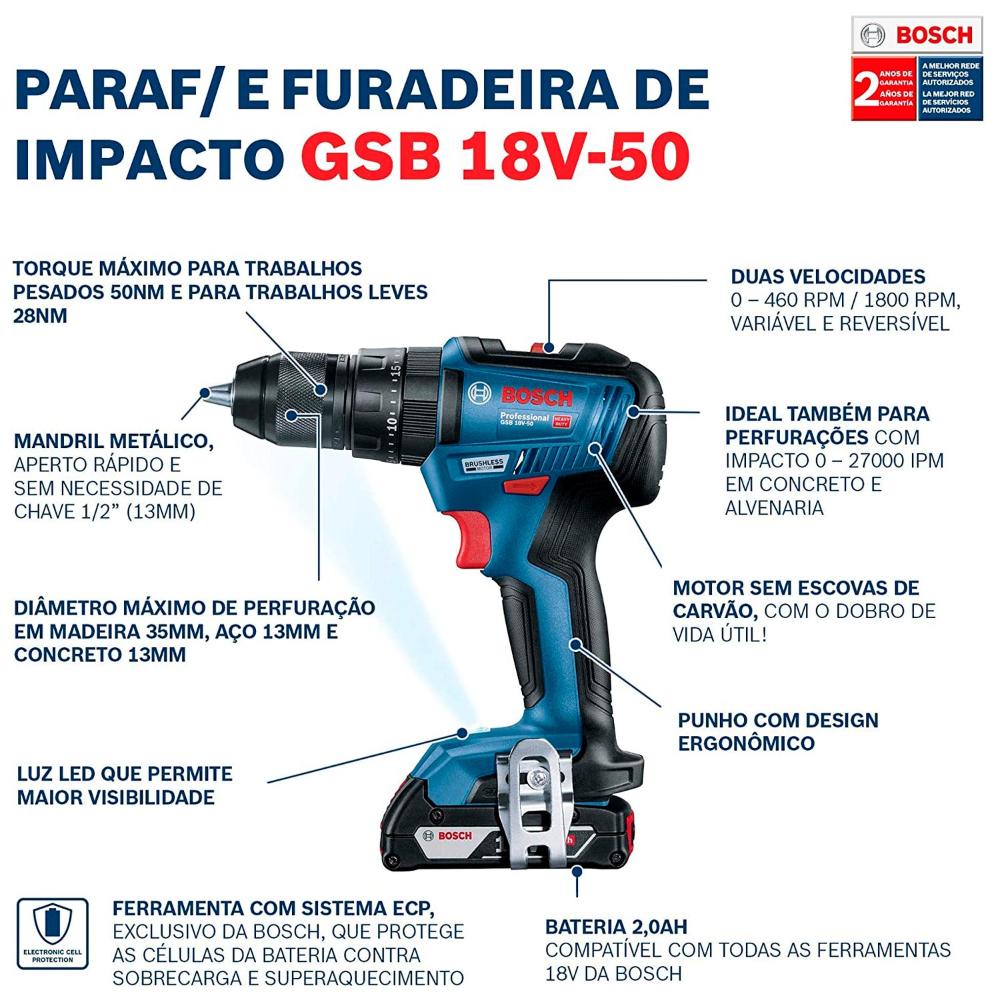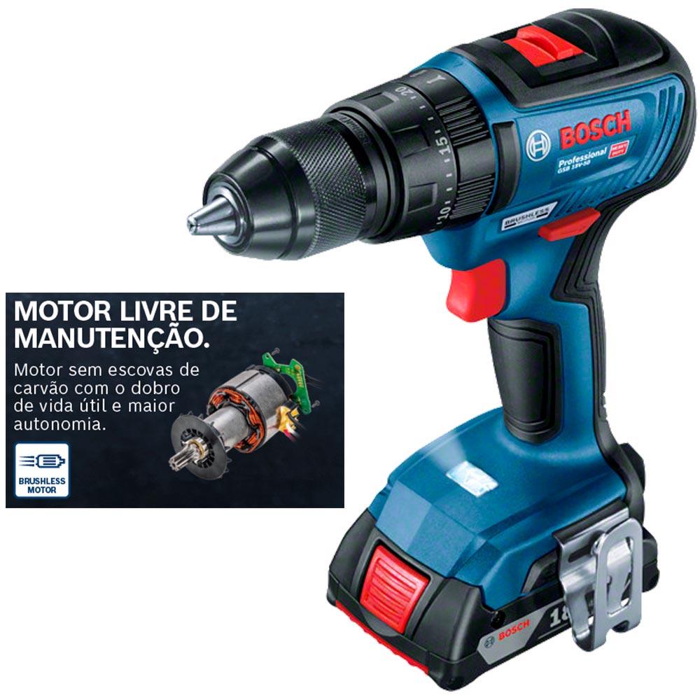 Parafusadeira Furadeira de Impacto Bateria 18V Motor Brushless 2 Baterias e Maleta GSB 18V-50 BOSCH