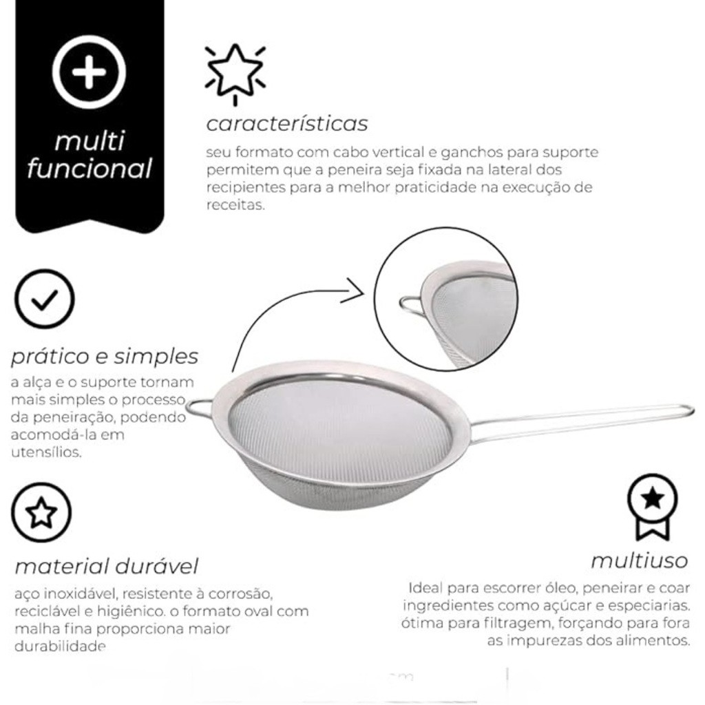 Peneira Tela Fina 1 Com Suporte Para Acomodação em Panelas de Inox Resistente Simples de Limpar