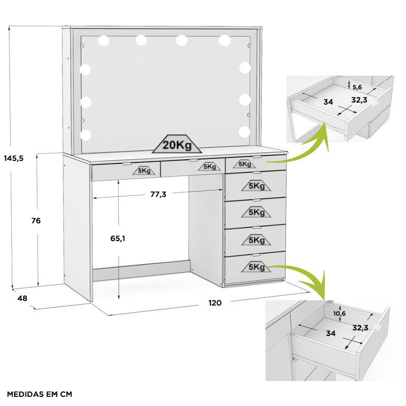 Penteadeira Ditália 7 Gavetas Branco c/ Kit Luz Camarim