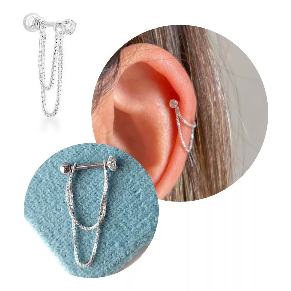 Piercing Orelha Cartilagem Hélix Ponto de Luz Corrente Prata 925