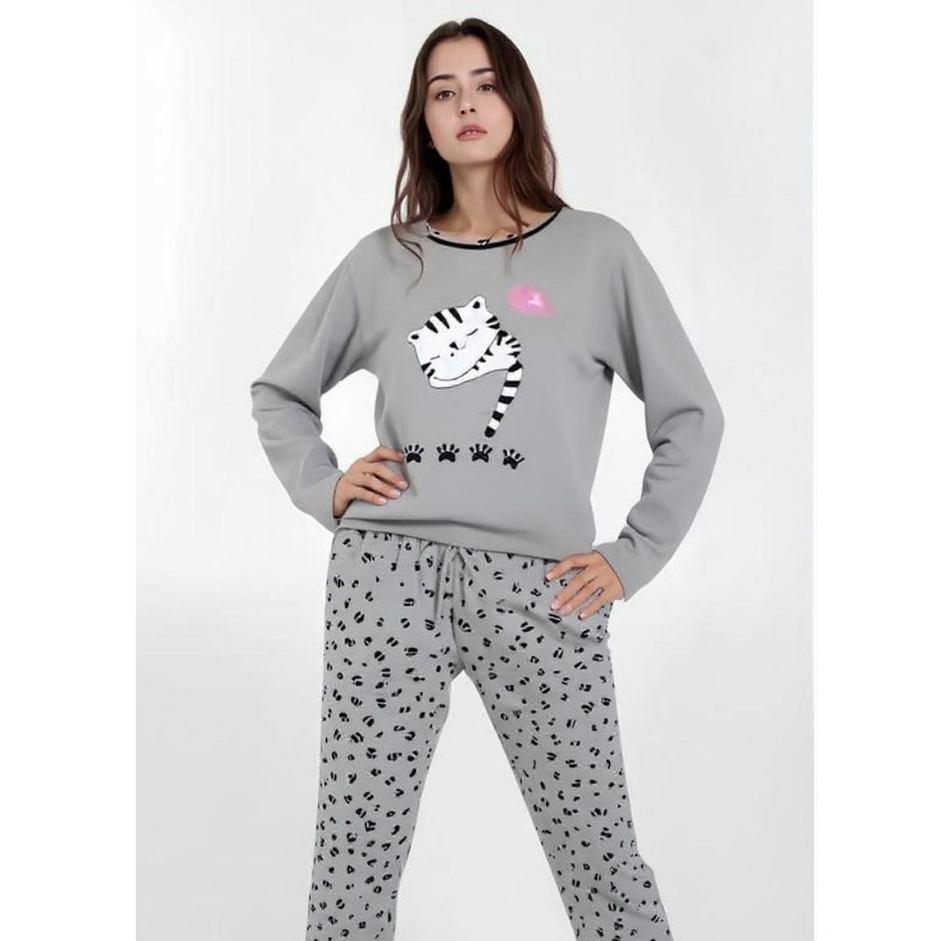 Pijama FB Feminino Gatinho Cinza Malha Premium Adulto Longo Confort Fechado Manga Comprida Inverno