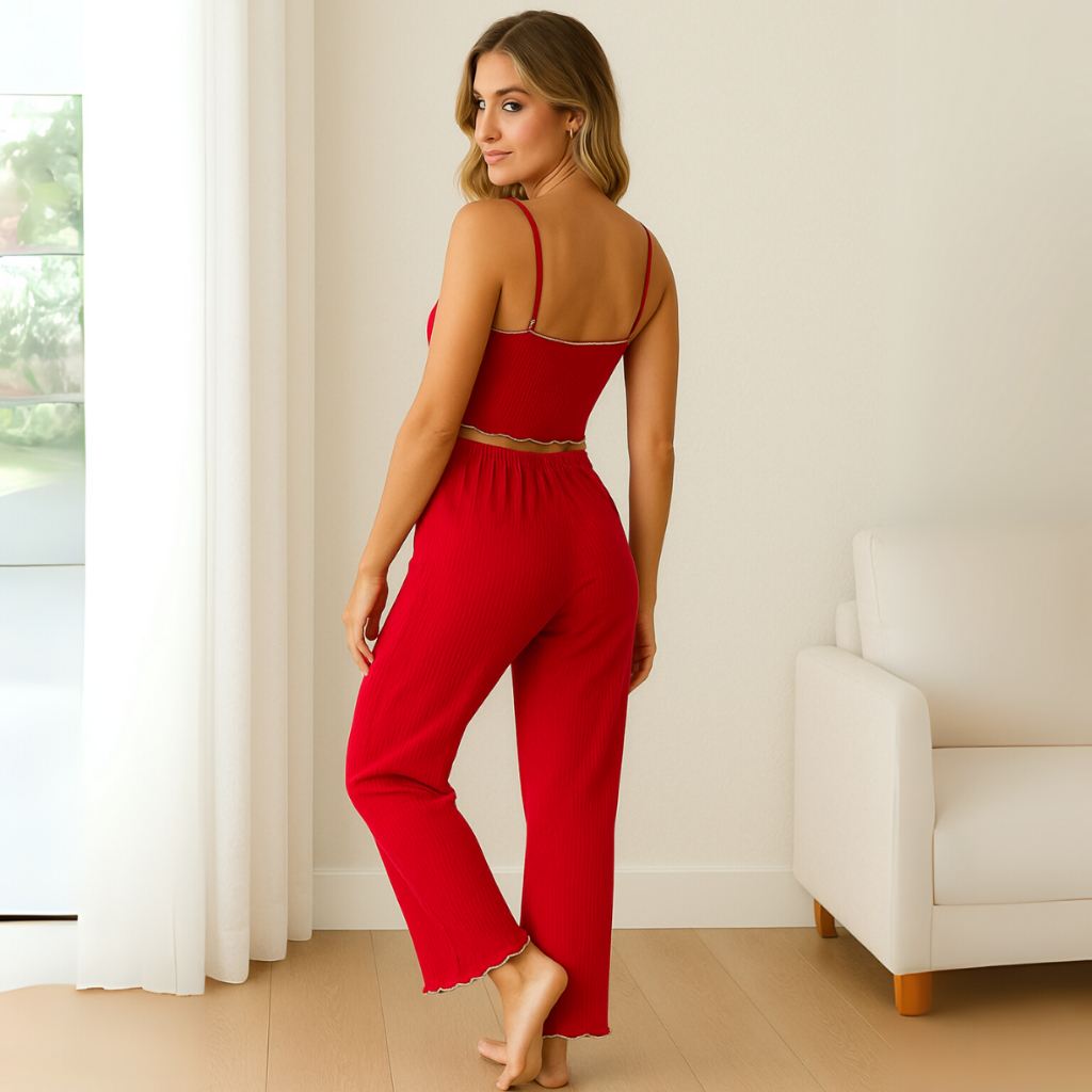 Pijama Feminino 2 Peças Longo Elegante Canelado Confortável Estilo