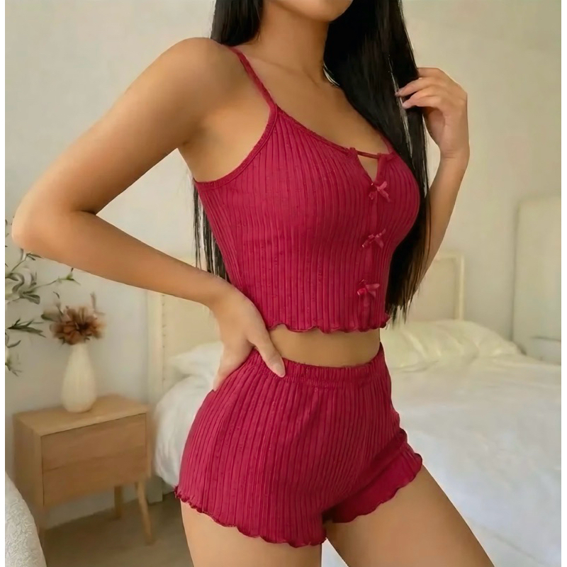 Pijama Feminino Canelado com Lacinho – Cropped Baby Doll Shorts Doll Conjunto