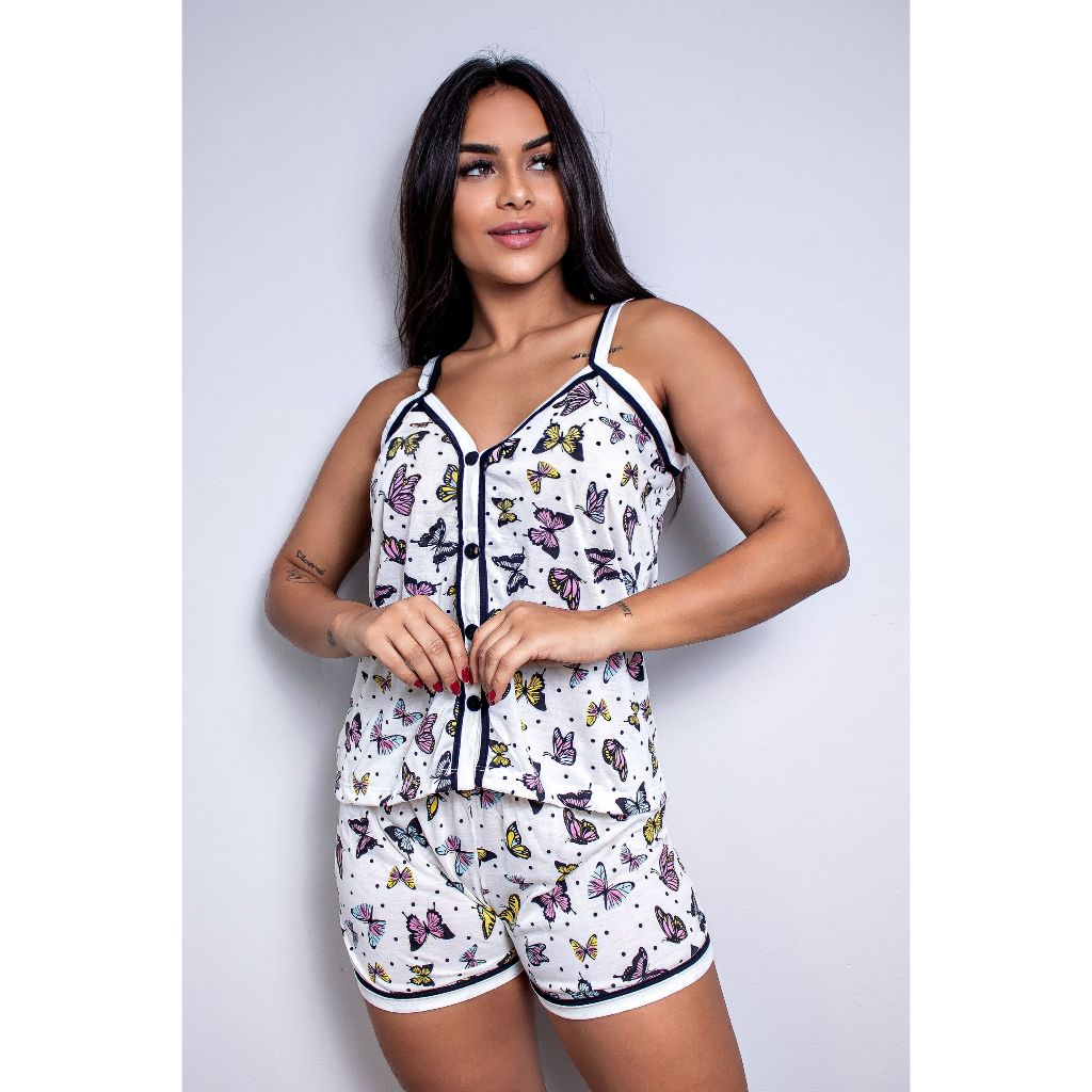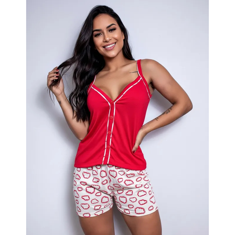 Pijama Feminino De Alça Americano Com Botões De Calor Verão Confortável Para Dormir Malha Fresca