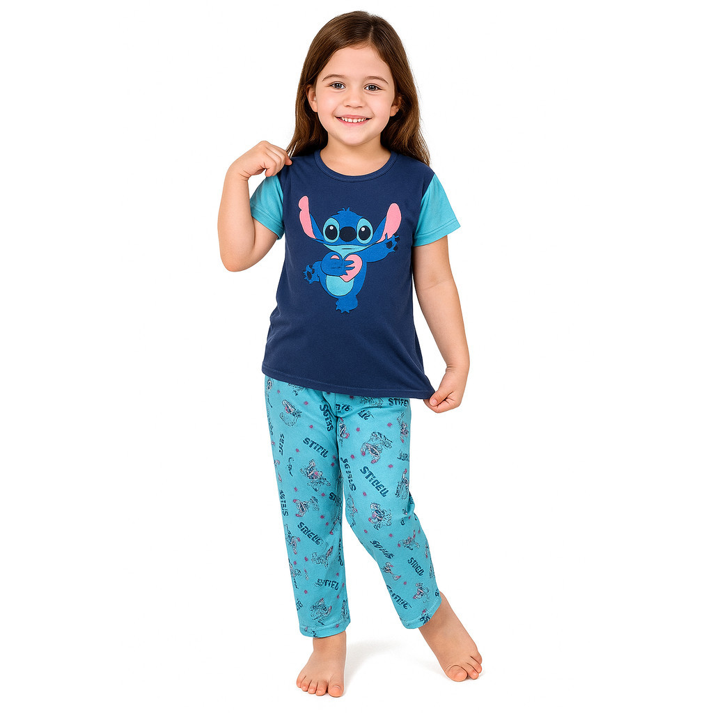 Pijama Infantil Feminino Inverno Meia Estação Lilo Stitch Estampado Malha PV Camisa e Calça