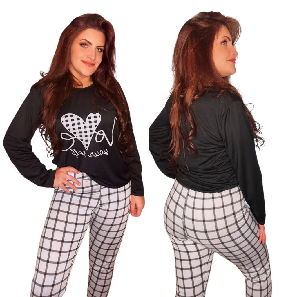 Pijama Longo Feminino Malha Adulto Manga Comprida Dejule Love Xadrez