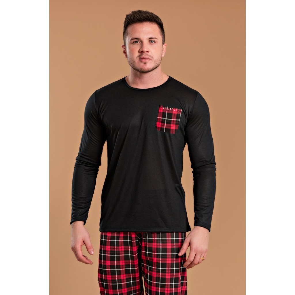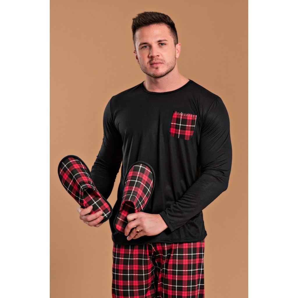Pijama Masculino Bolso Xadrez Vermelho + Pantufa Masculino Xadrez Vermelho