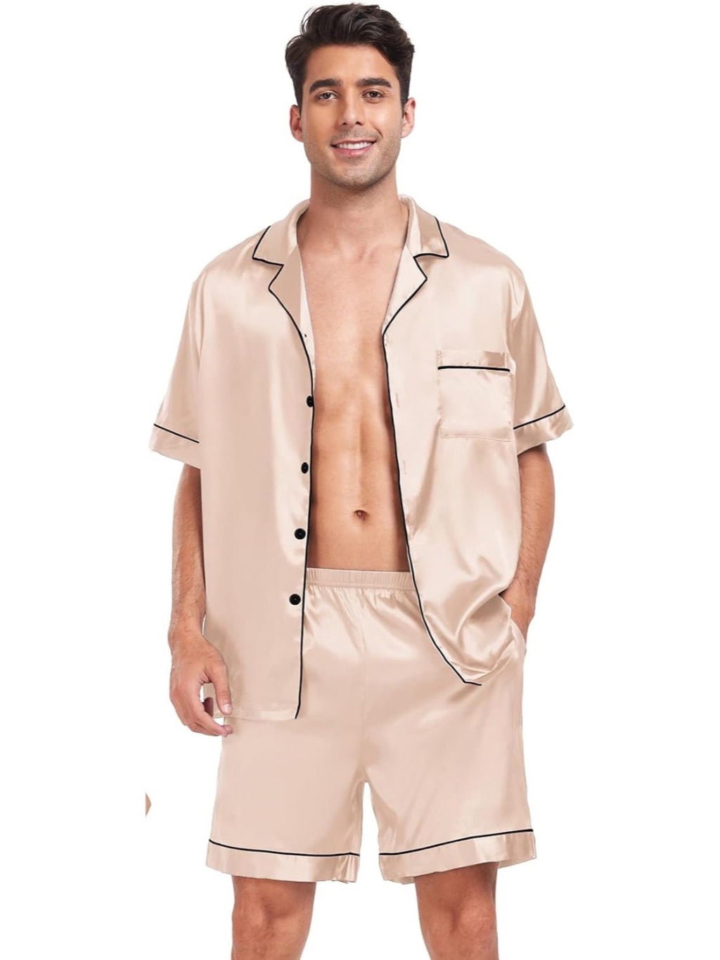 Pijama Masculino Marcos em Cetim com Elastano Short e Camisa Manga Curta com Bolso Botões Champanhe