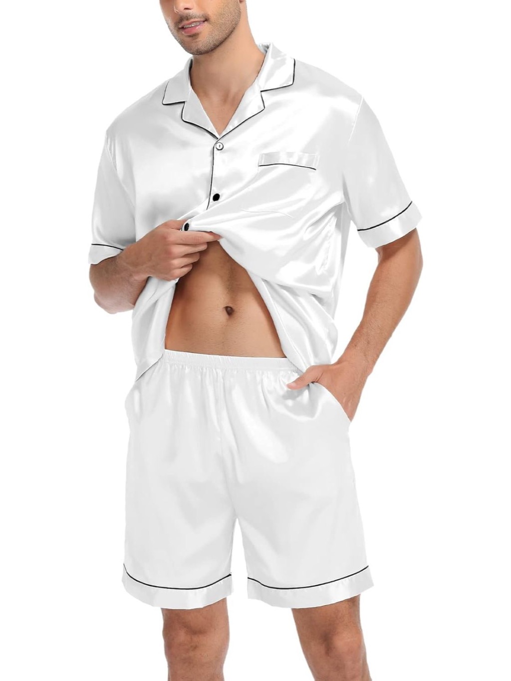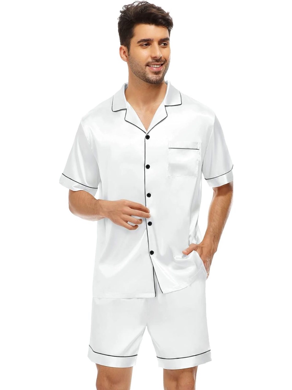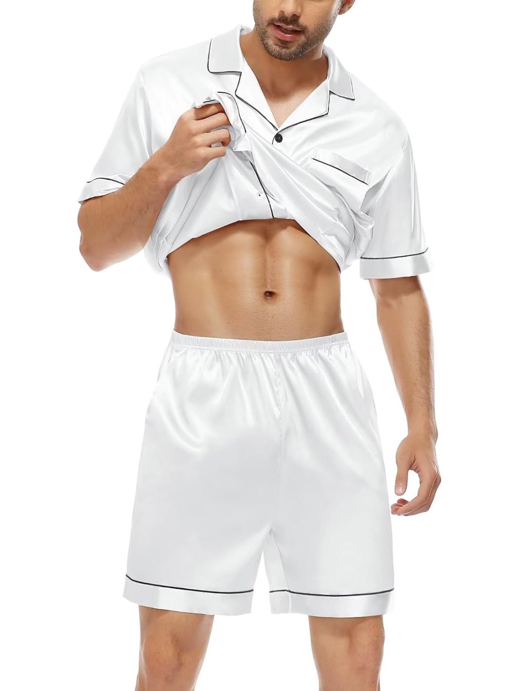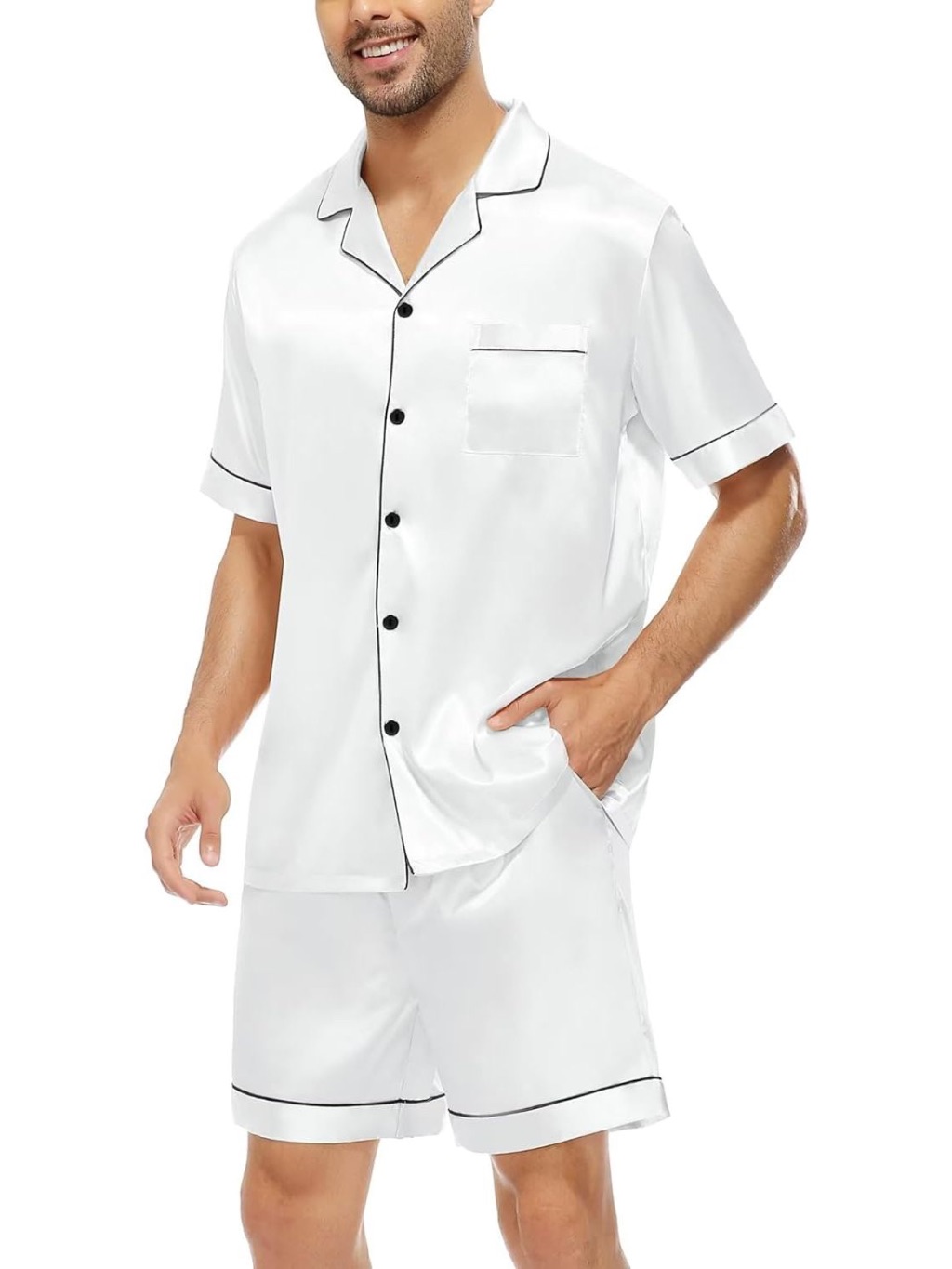 Pijama Masculino Marcos em Cetim com Elastano Short e Camisa Manga Curta com Bolso e Botões - Branco