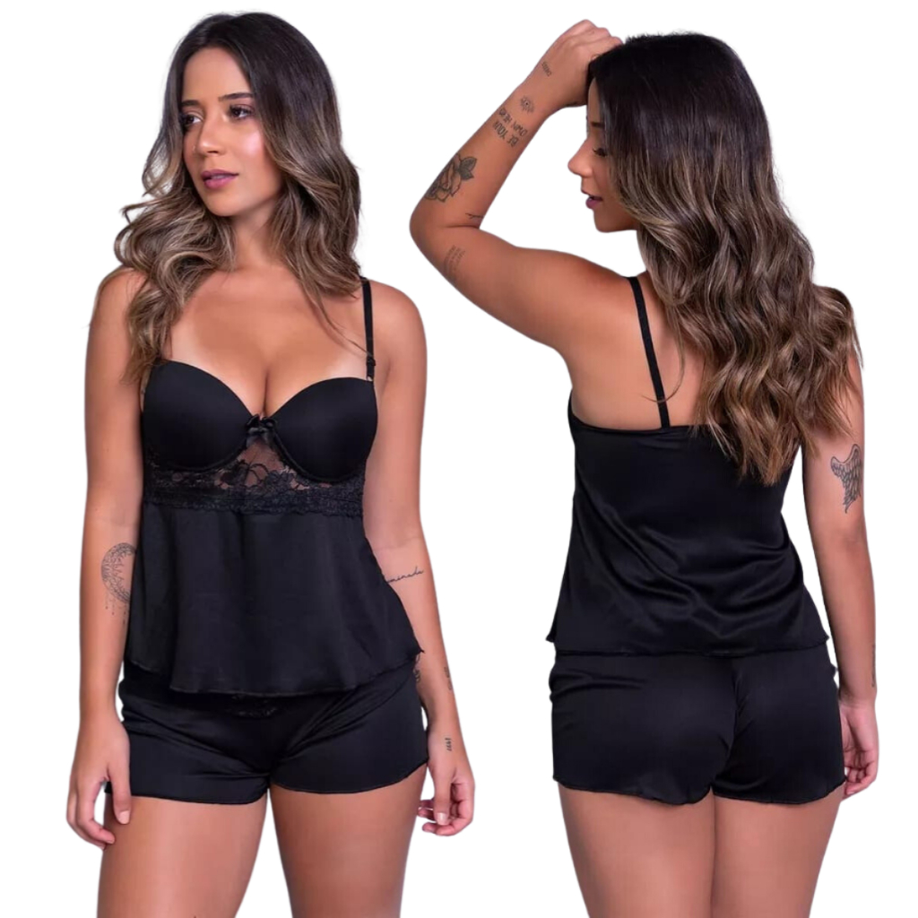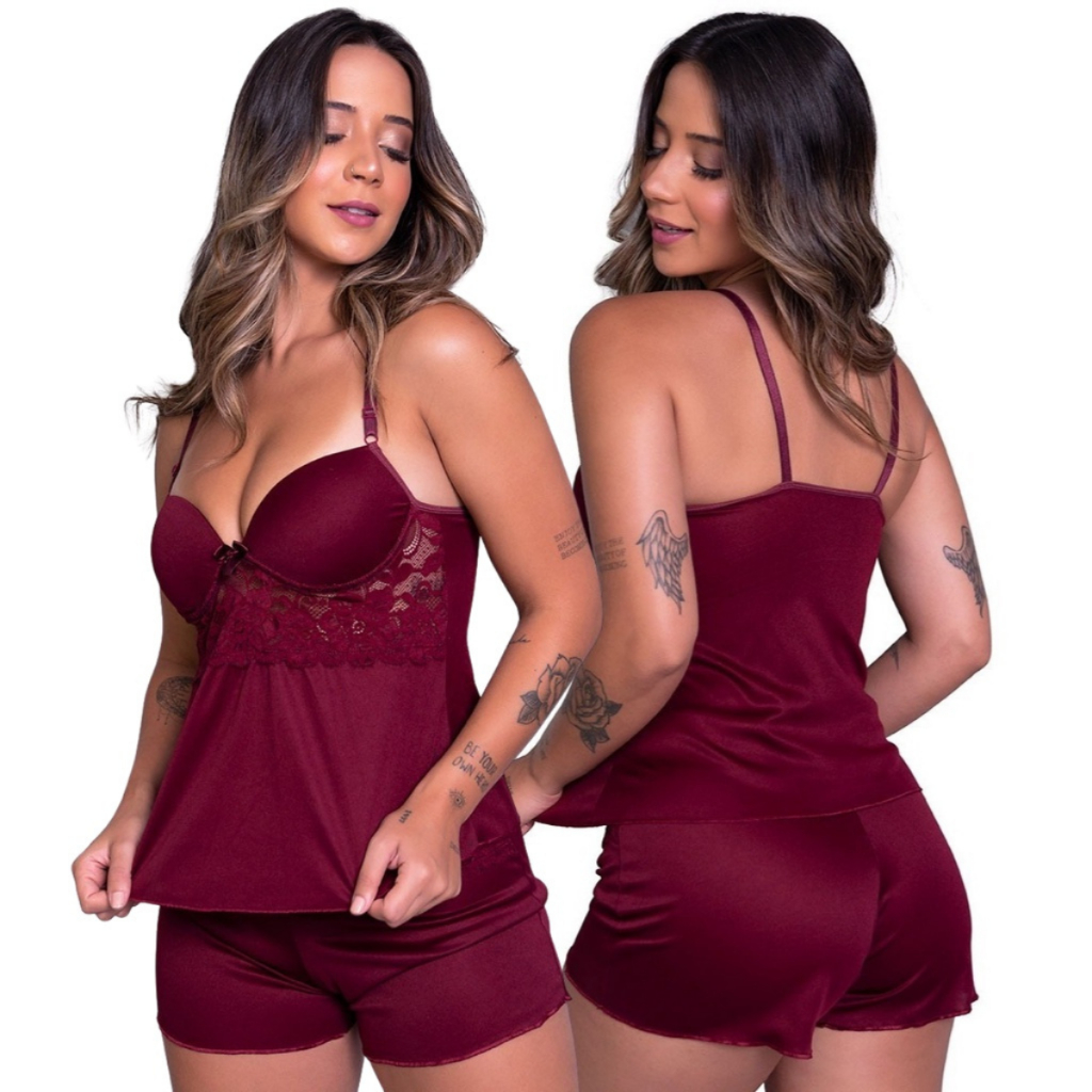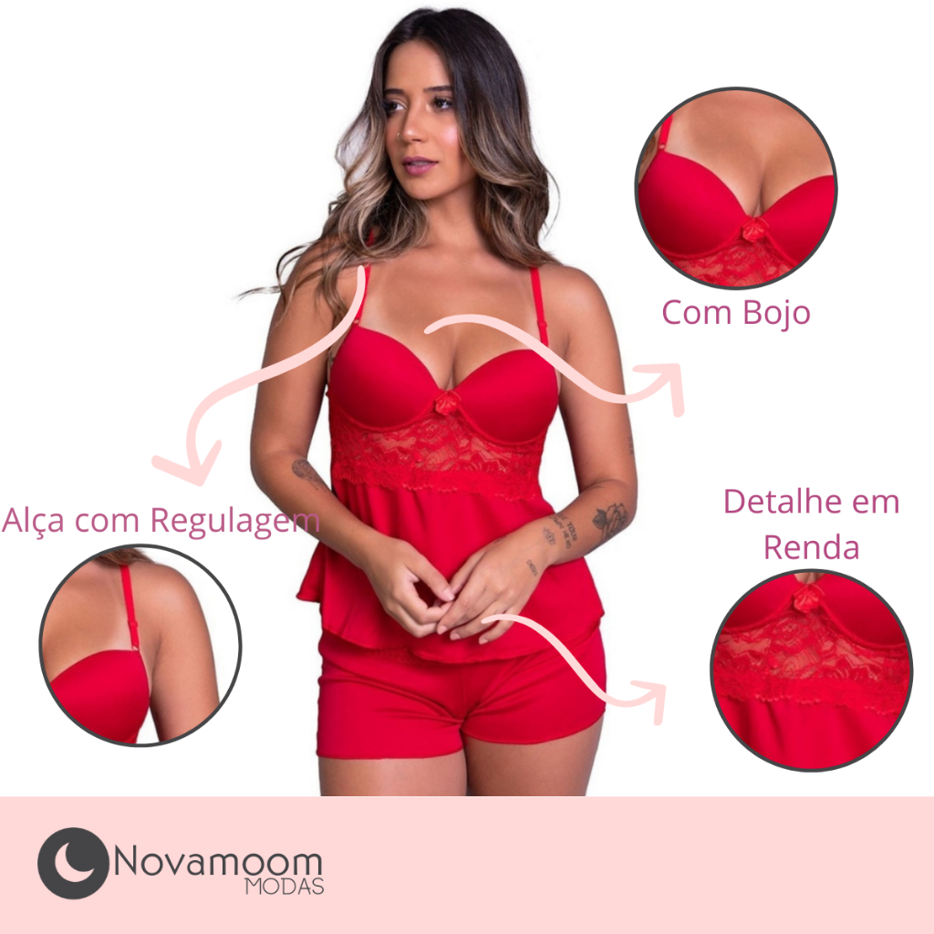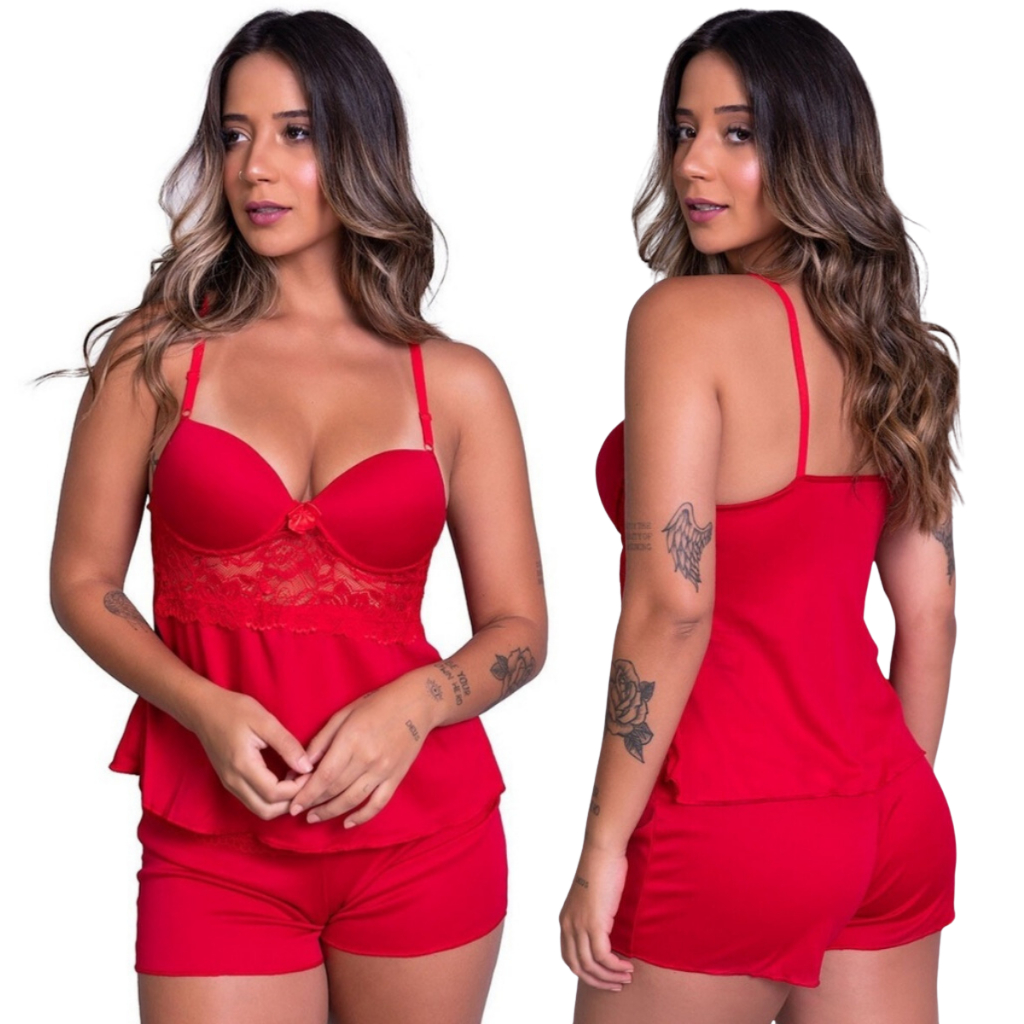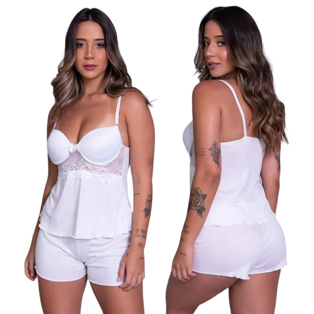 Pijama Short Doll com Bojo Alça Verao Feminino Dormir Confortavel Renda Cropped