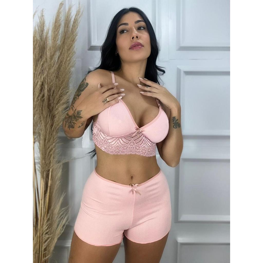 Pijama Top Renda Cores Variadas Short Doll Feminino Roupa de Dormir Detalhe de Luxo