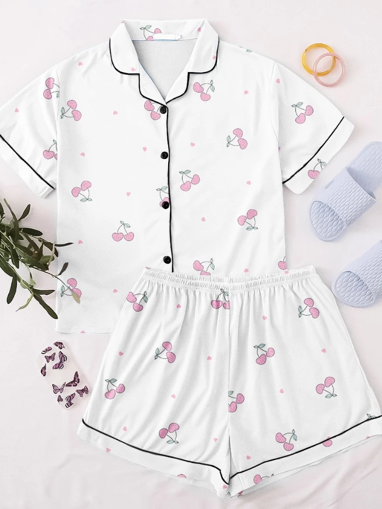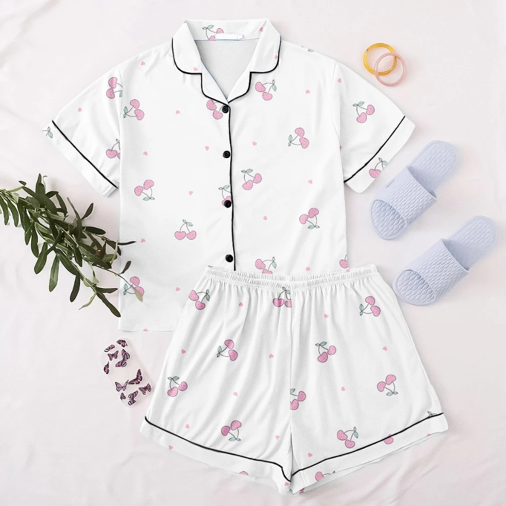 Pijama de Botão Americano Feminino Blogueira Estiloso Temático Meia Manga Short Doll Fofo