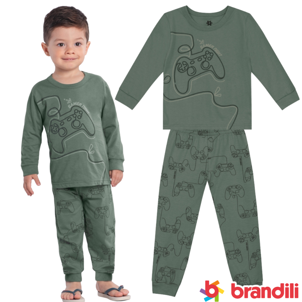 Pijama infantil menino Inverno Camiseta Manga Longa e calça malha leve Estampa Gamer Video Game em puff Brandili