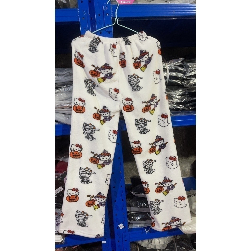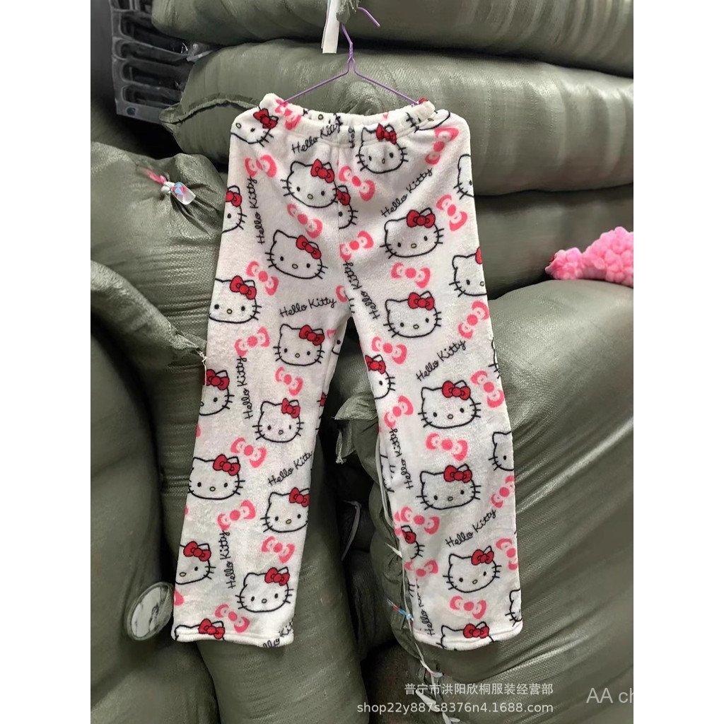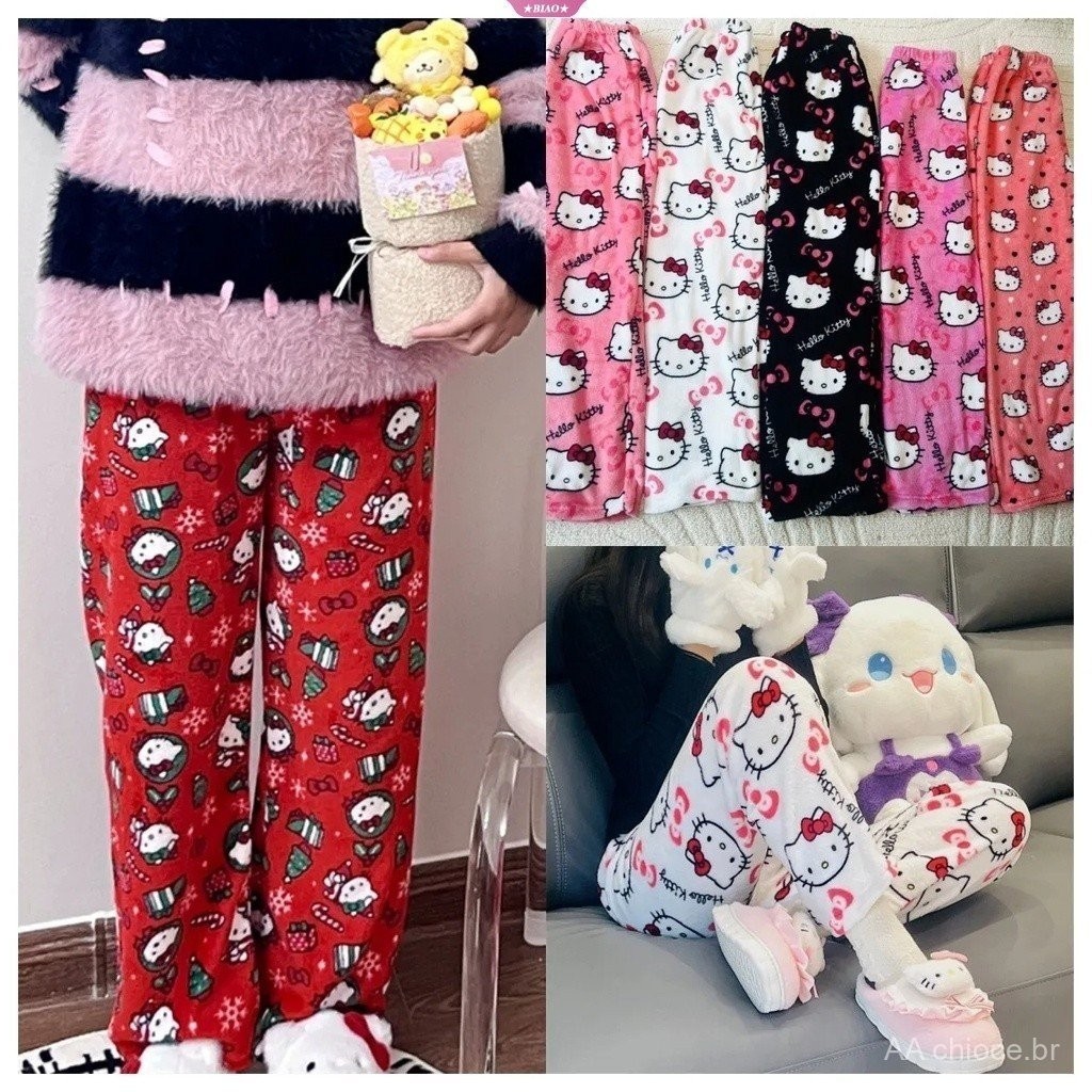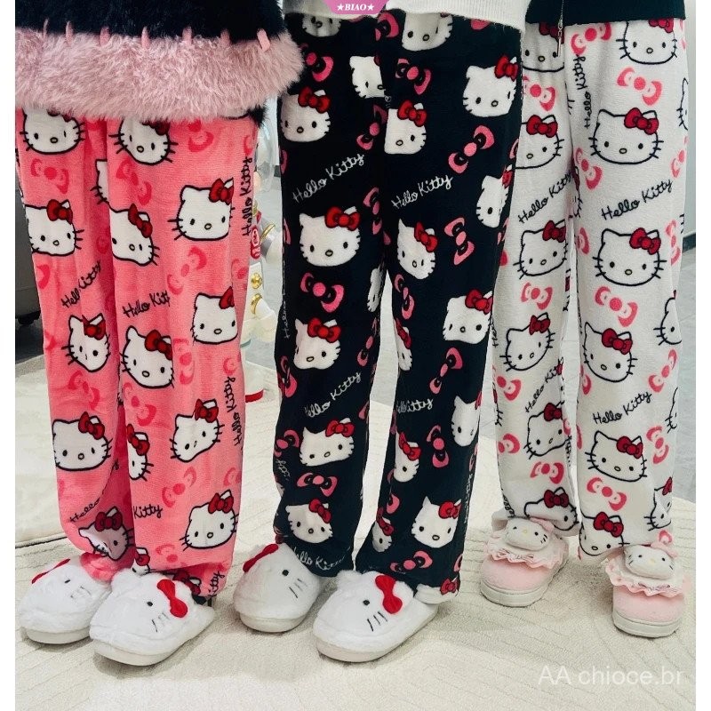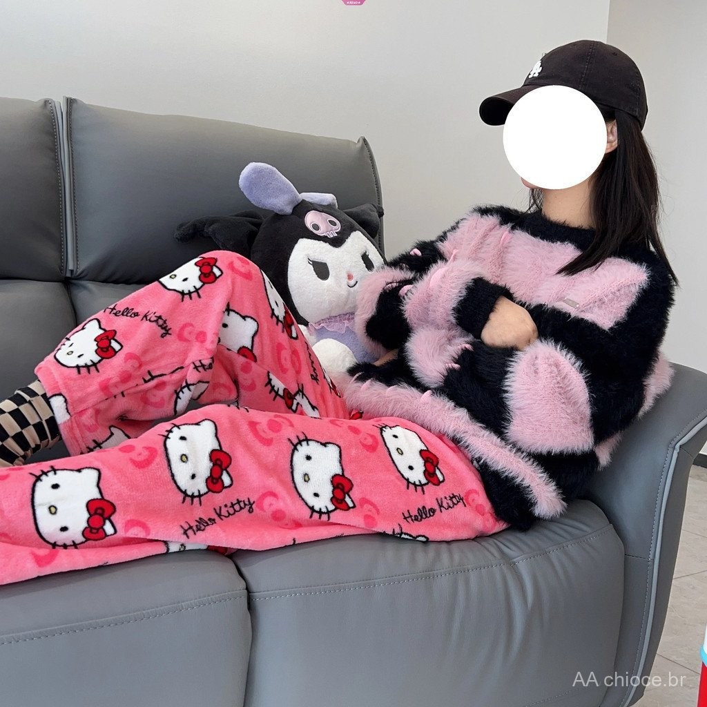 Pijamas Casuais de Flanela Preta para Mulheres Sanrio Hello Kitty, Calças de Lã Quentes, Moda Outono Inverno