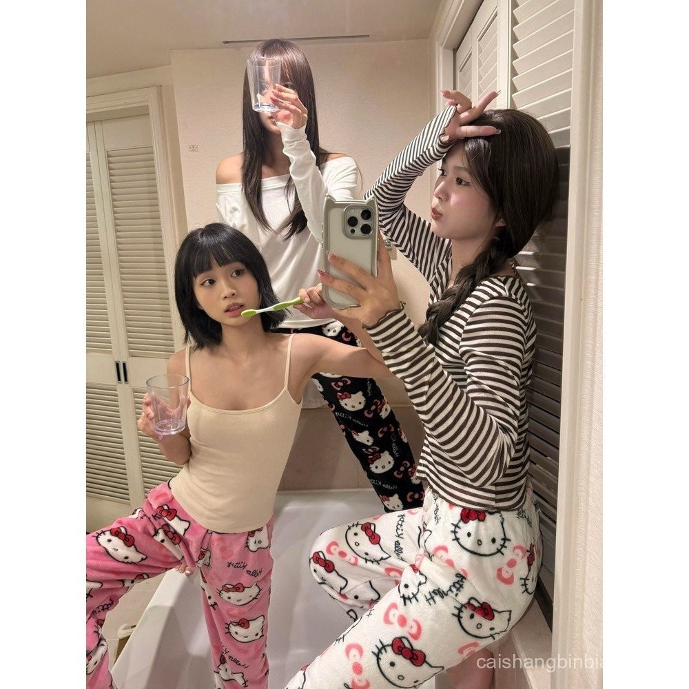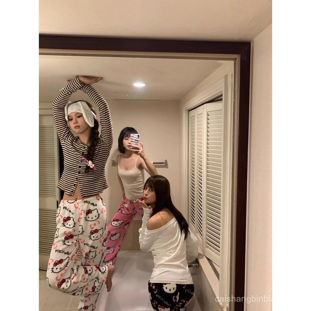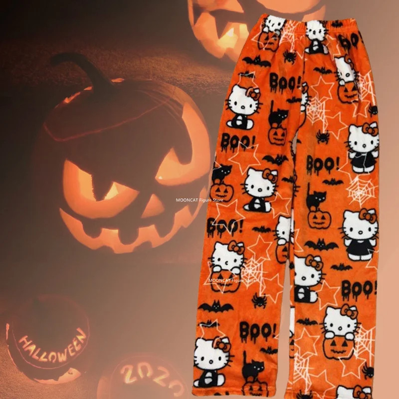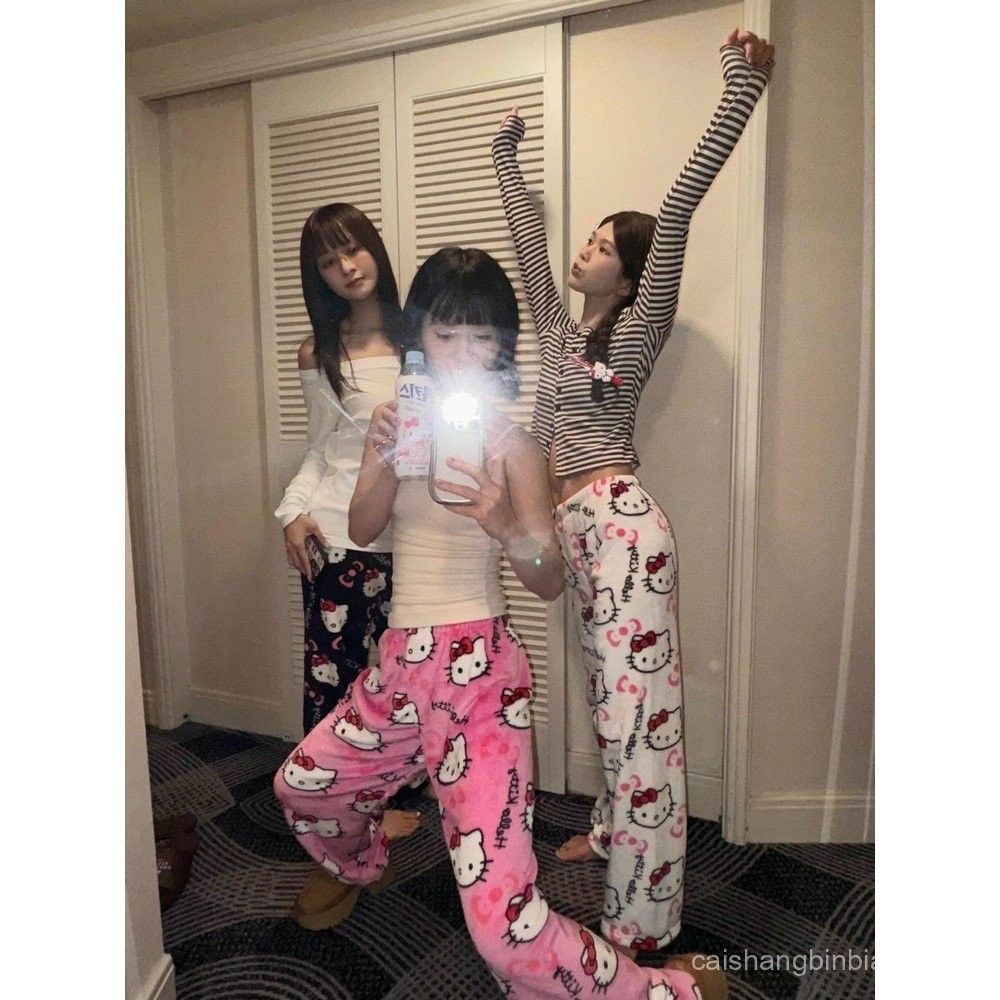 Pijamas de Flanela Kawaii Sanrio Hello Kitty Anime Mulheres Calças Longas de Lã Quente Cartoon Loungewear Casual