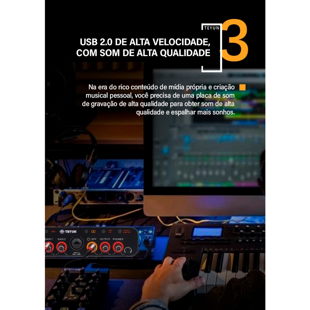 Placa de som de interface de áudio USB TEYUN Q-26 com guitarra elétrica para gravação ao vivo Placa de som externa USB