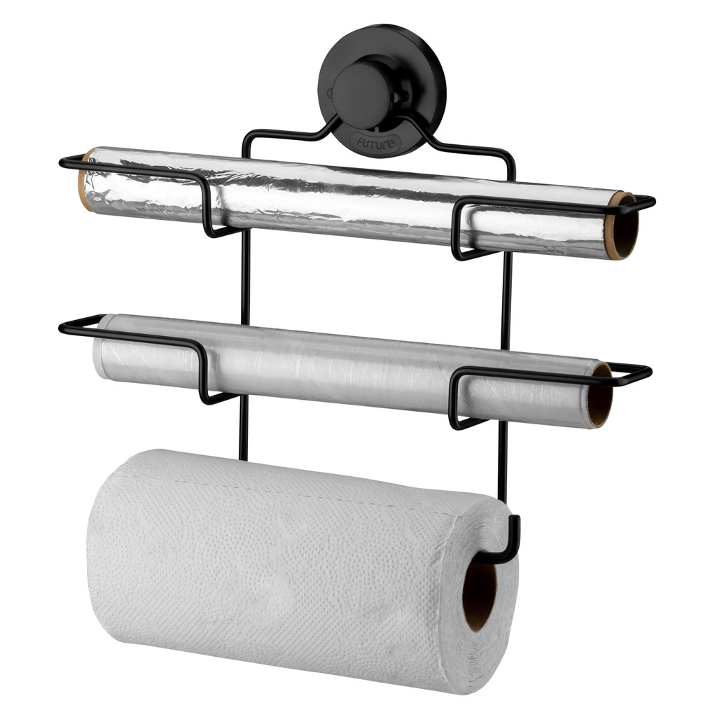 Porta Papel Toalha Triplo Suporte Rolos Para Cozinha 3 em 1 Com Ventosa Future Preto Fosco
