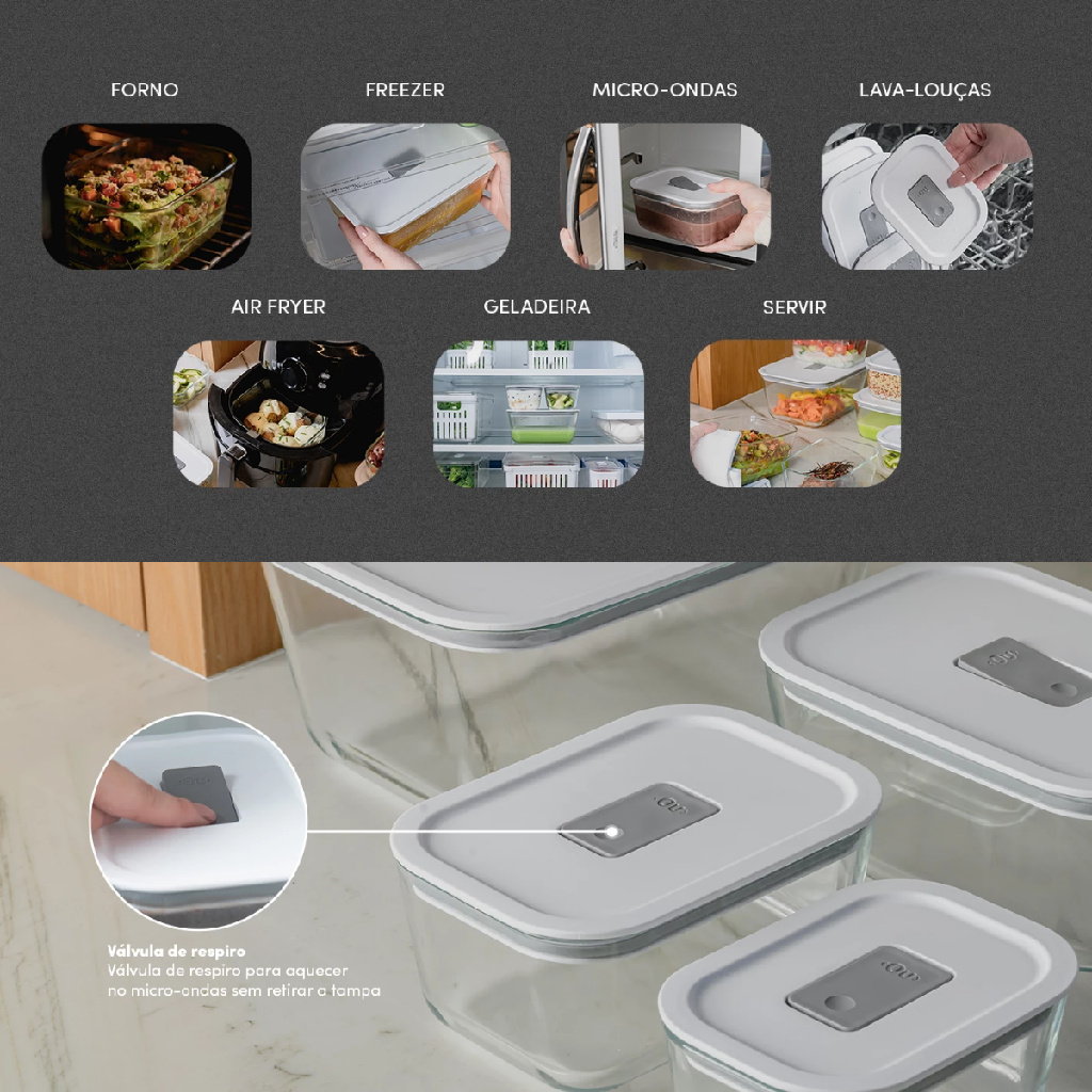 Pote De Vidro Hermético C/ Tampa Resistente Pode Ir Forno Air Fryer Micro Ondas Congelador Geladeira
