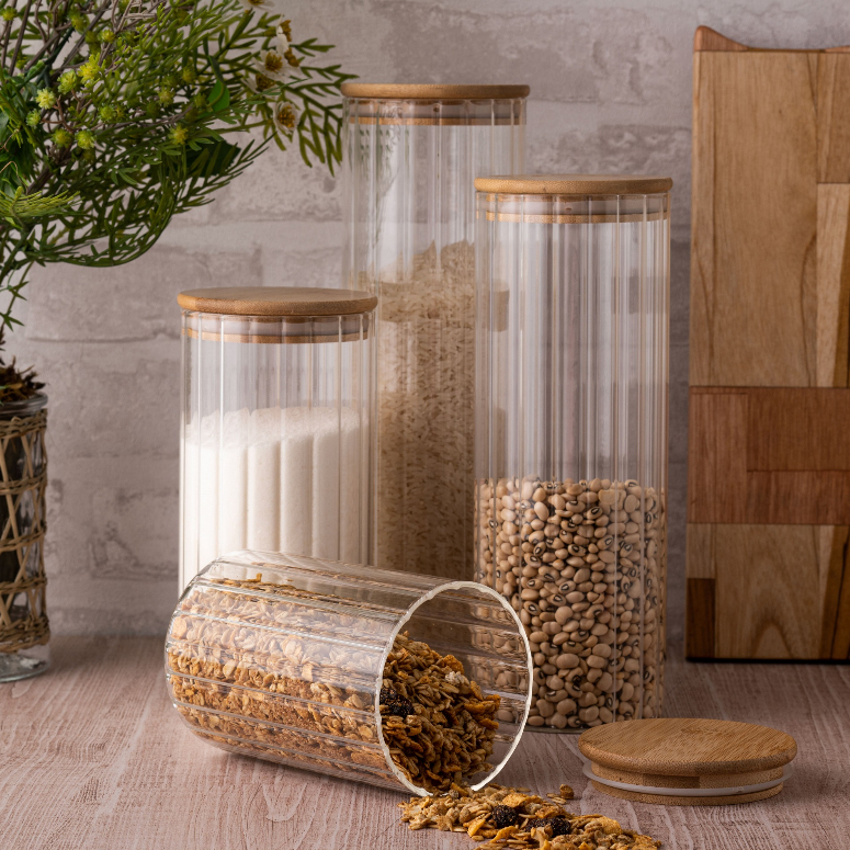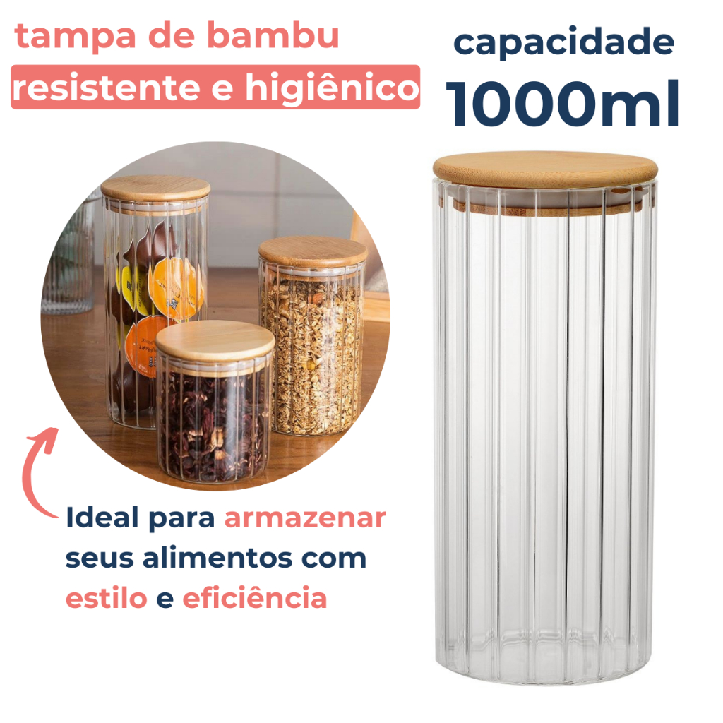 Pote Vidro Canelado Hermético 1000ml Porta Mantimentos Com Tampa Bambu