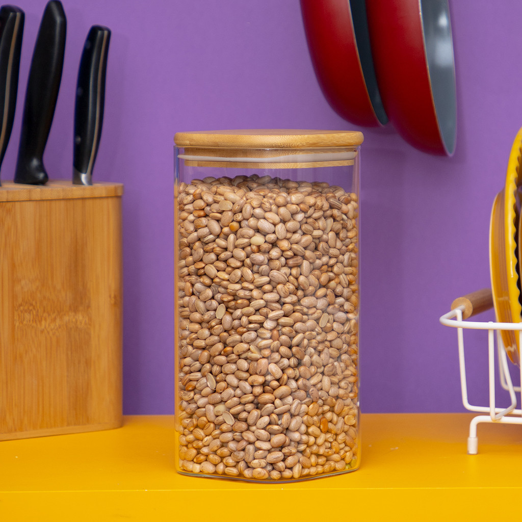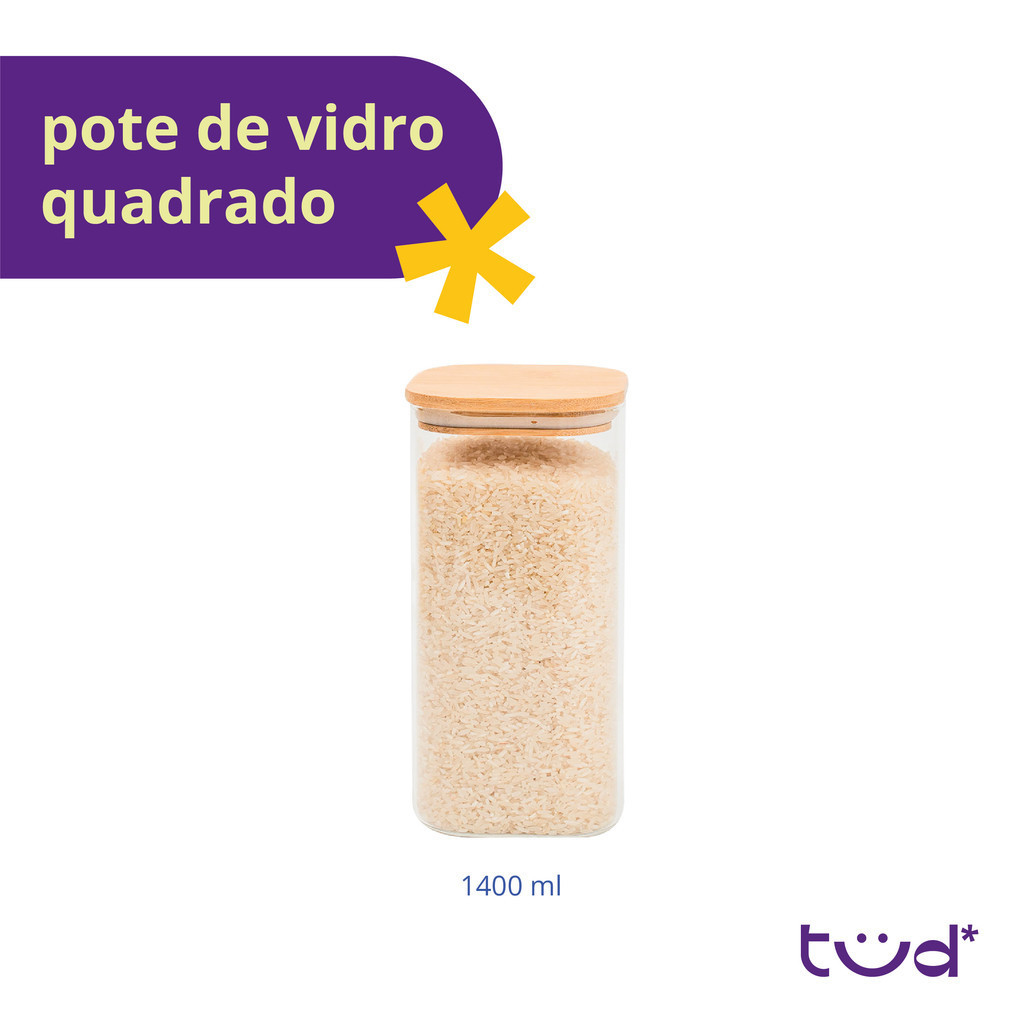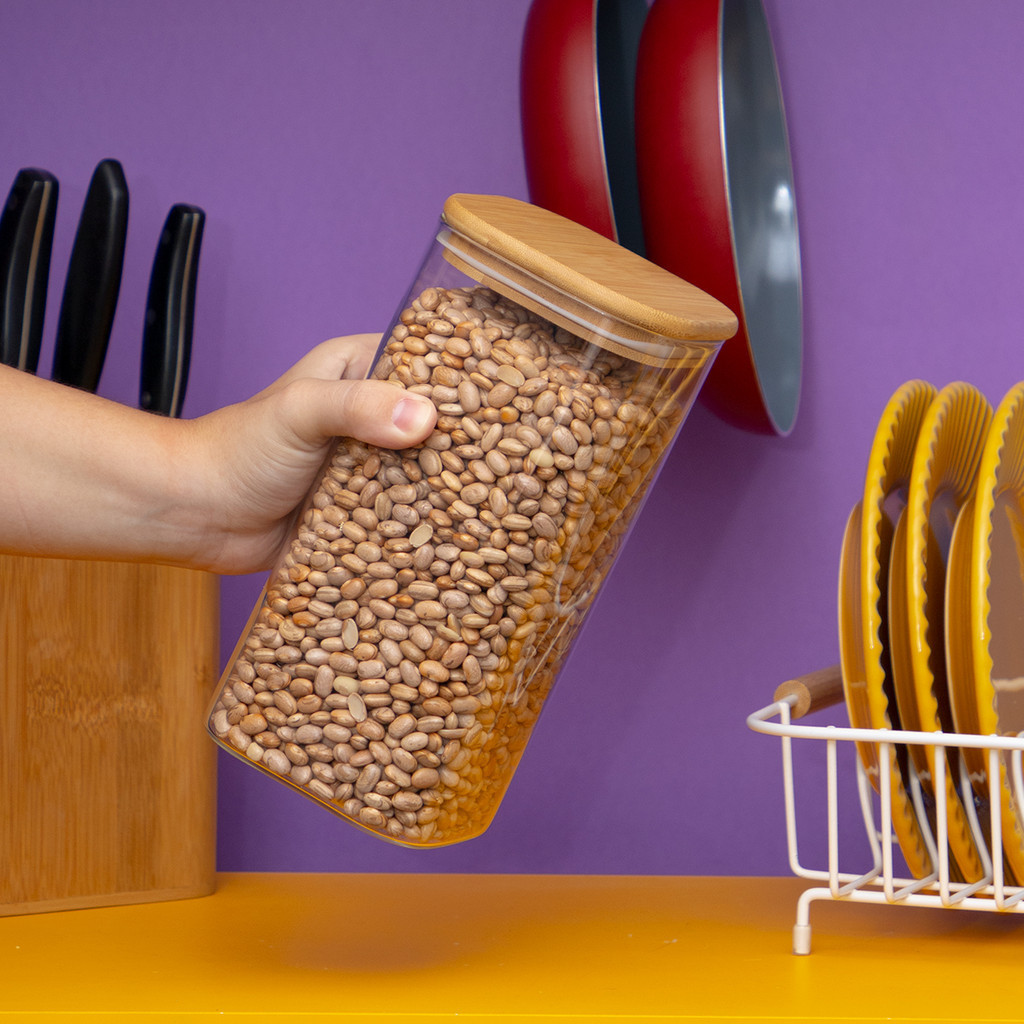 Pote de vidro 1,4Lcom tampa de bambu hermético quadrado - Tud