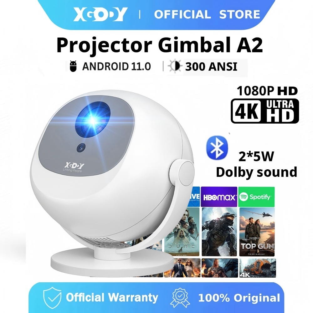 Projetor XGODY Gimbal A2 Android 11 HD 1080P Foco Elétrico Alto-Falante Embutido 2x3W 300 ANSI Home theater