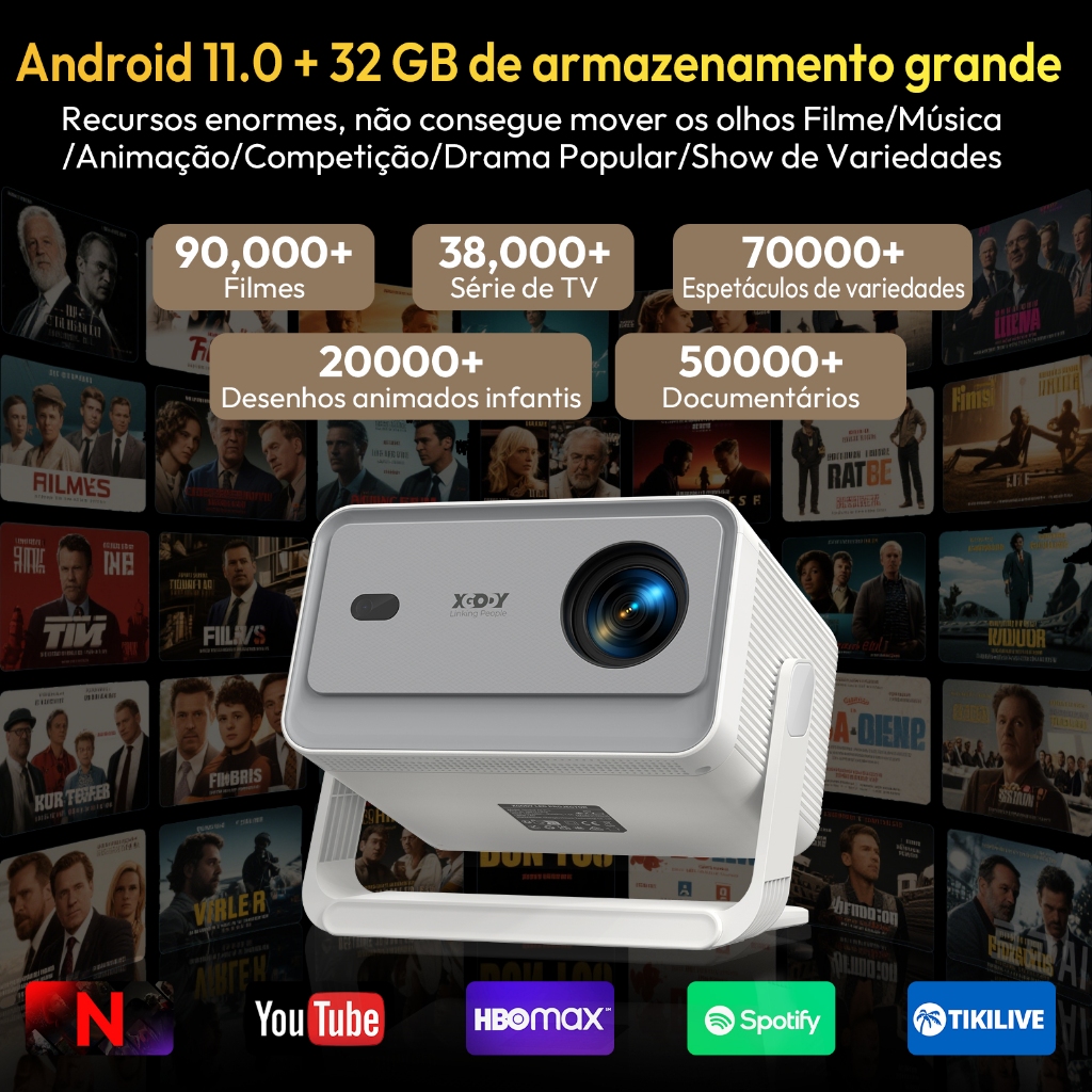 Projetor XGODY Gimbal A6 Pro 1GB + 32GB Foco Automático 1080P Ultra HD Home Cinema Integrado YouTube Netflix 700 ANSI