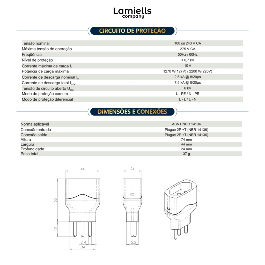 Tomada Protetora Contra Raios DPS Embrastec Pocket 3 Pinos Anti-Raio Bivolt 127/220V 10A