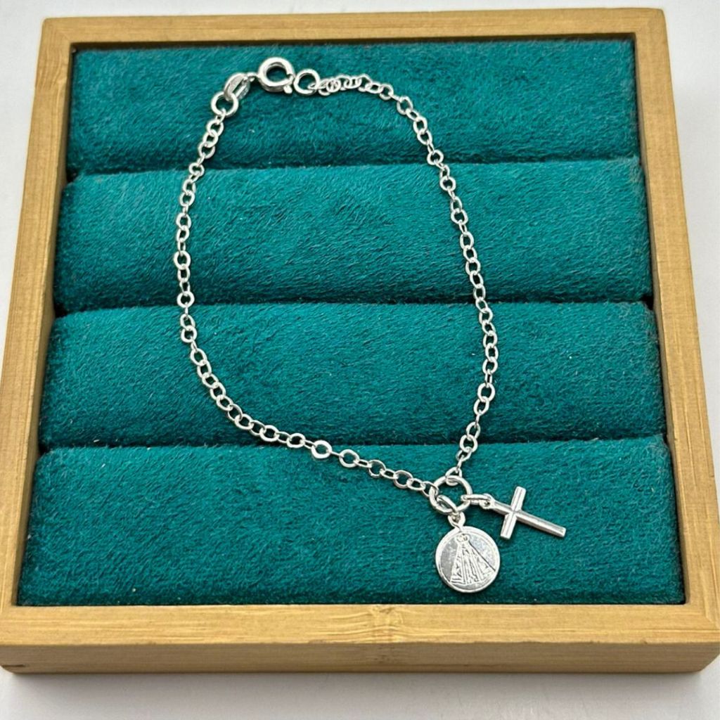 Pulseira Feminina de Prata 925 Cruz e Placa Nossa Senhora