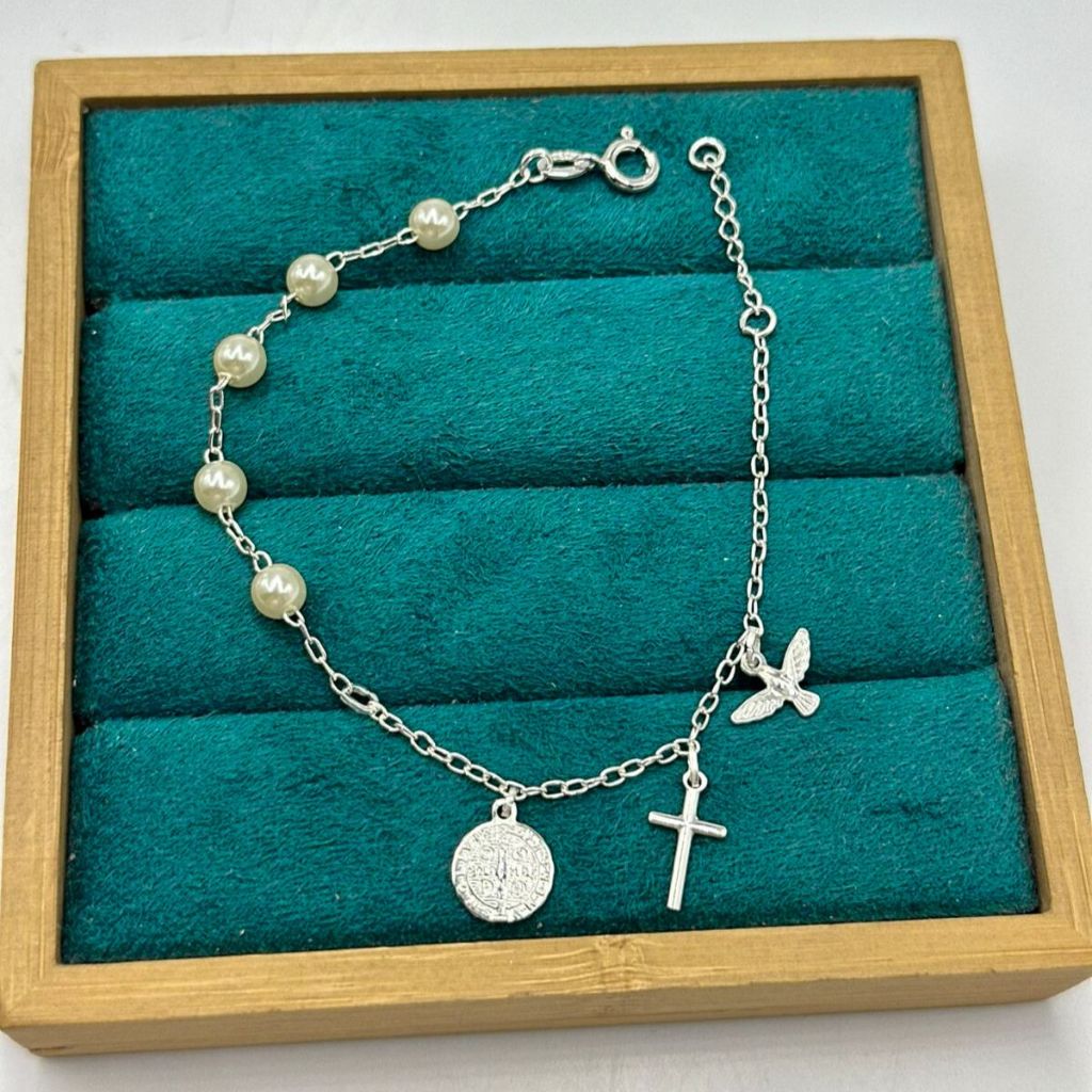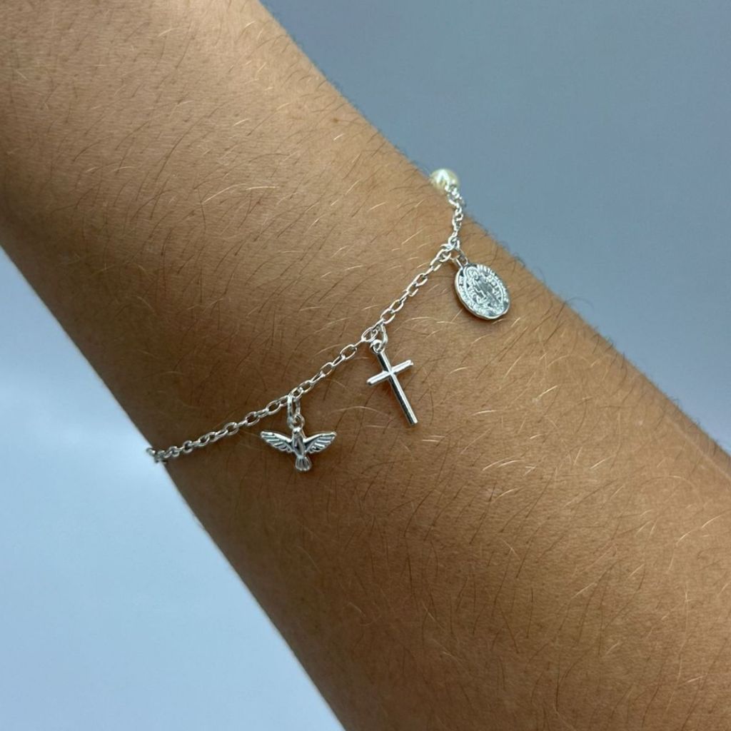 Pulseira Feminina de Prata 925 Pérola e Pingentes Religiosos pendente