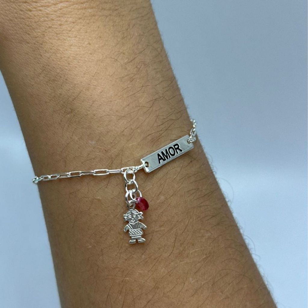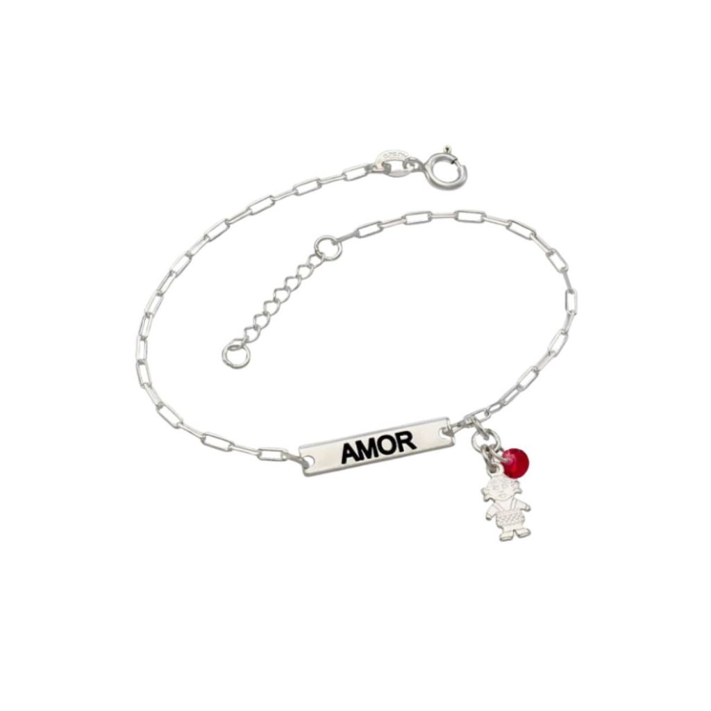 Pulseira Feminina de Prata 925 Placa Amor e Menina com Zircônia