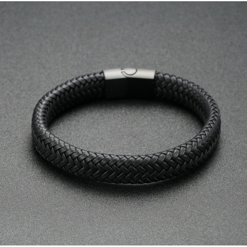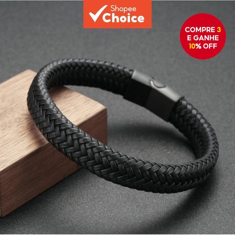 Pulseira masculina de couro trançado com fecho magnético