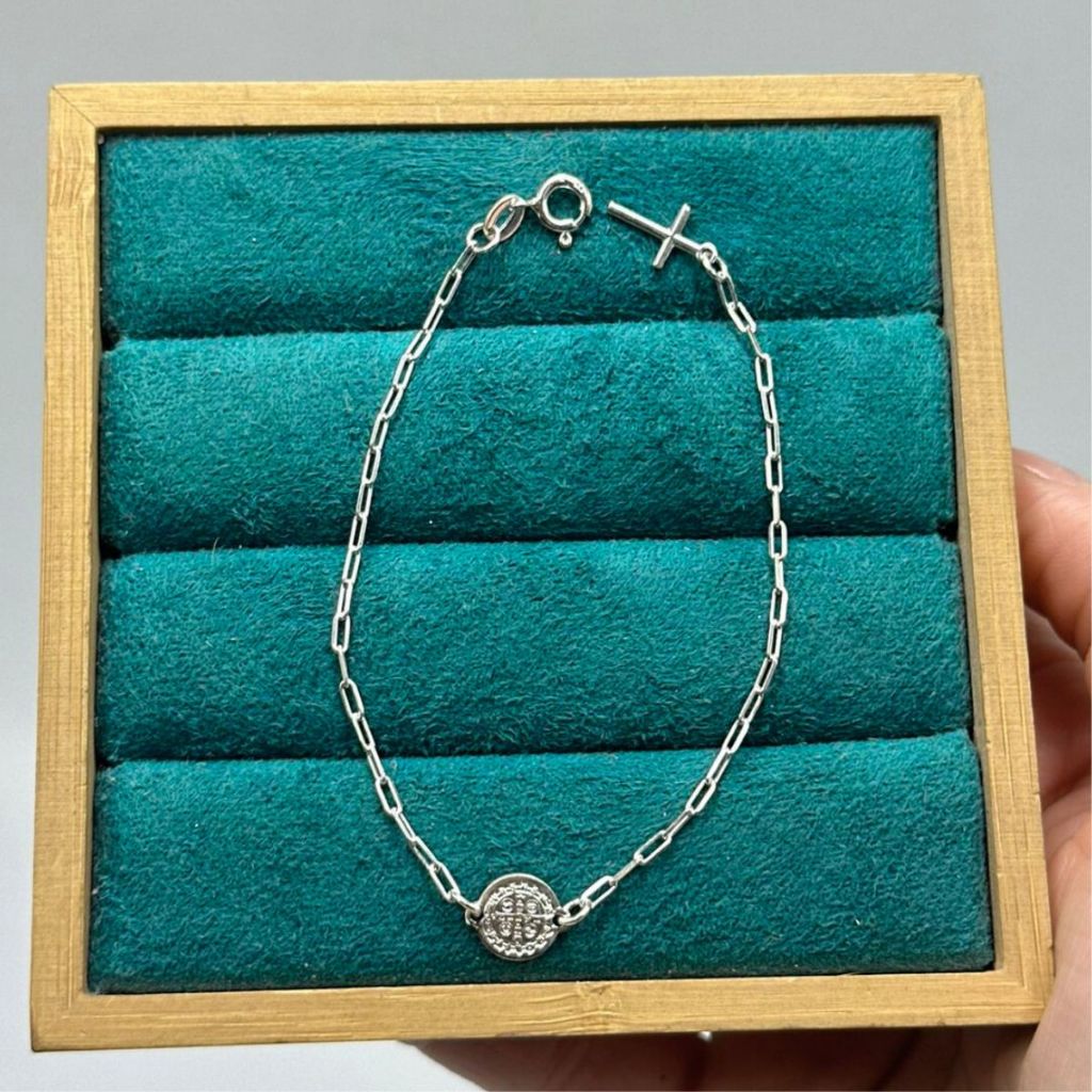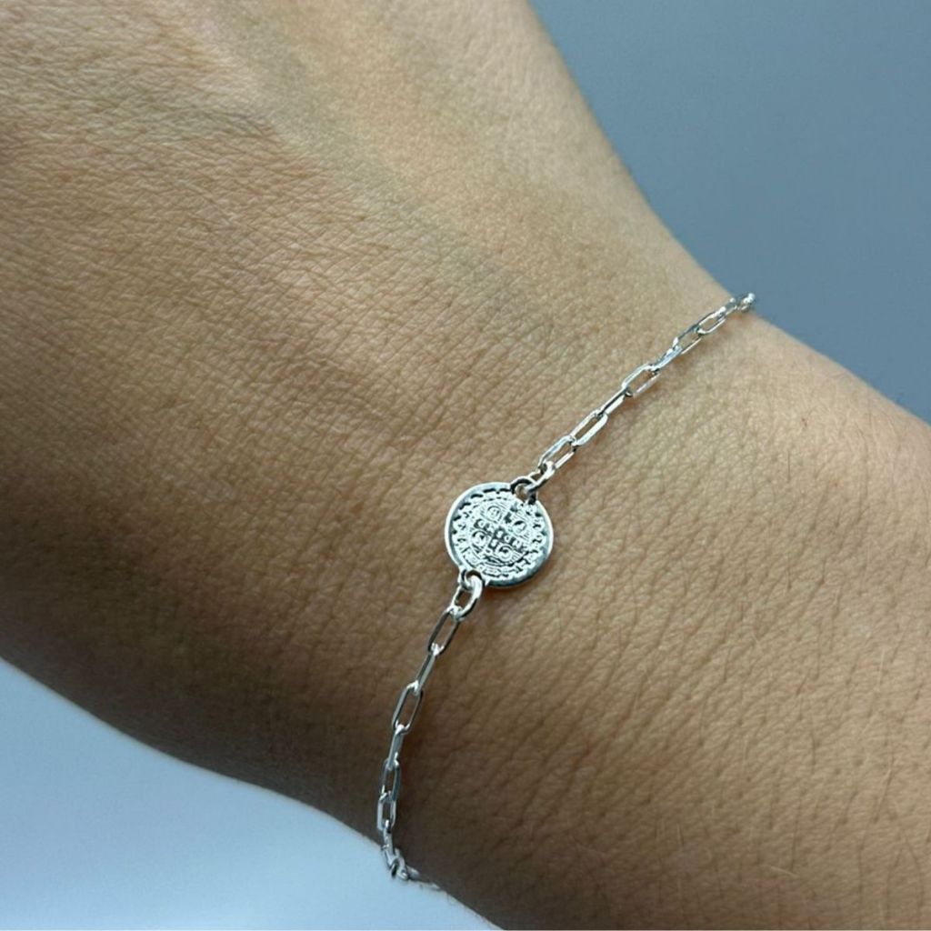 Pulseira medalha de São Bento e cruz - prata 925