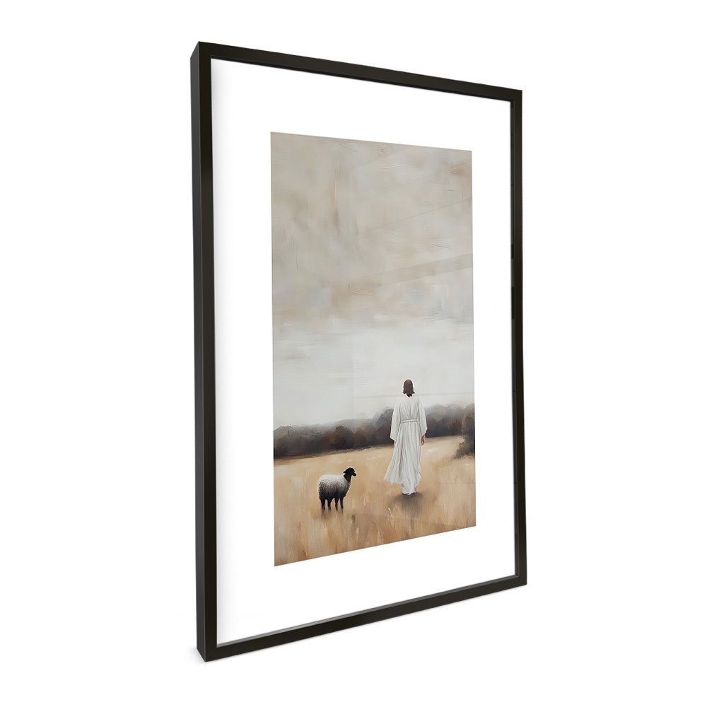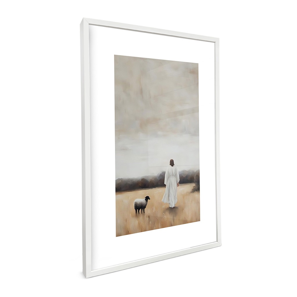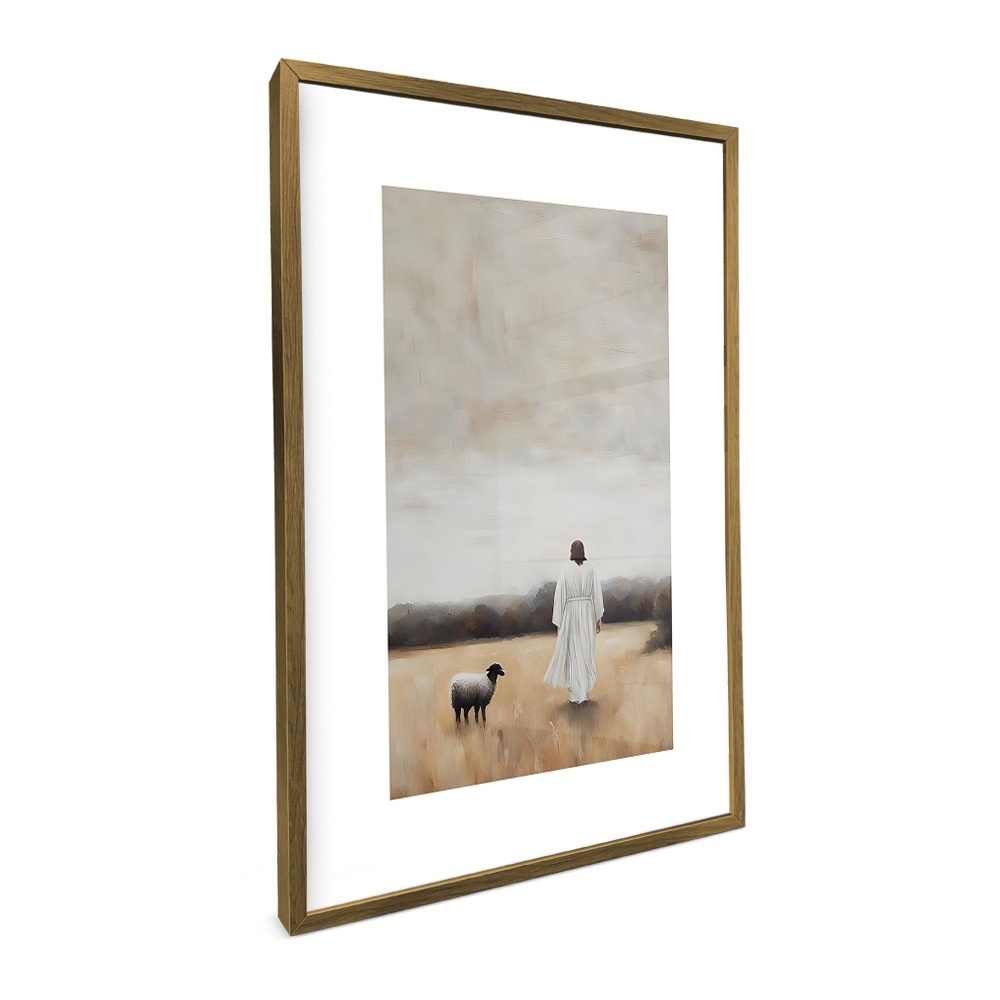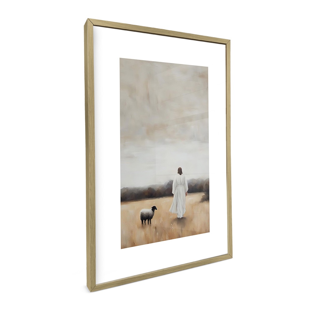 Quadro Decorativo com Moldura Sala Quarto Jesus Pastor e a Ovelha Tons Claros