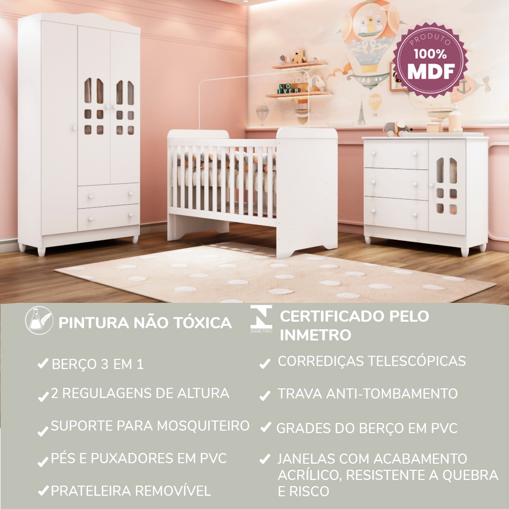 Quarto Bebê Completo Berço Americano 3Em1 Gabrielle Guarda Roupa 3 Portas Cômoda Infantil 100% MDF