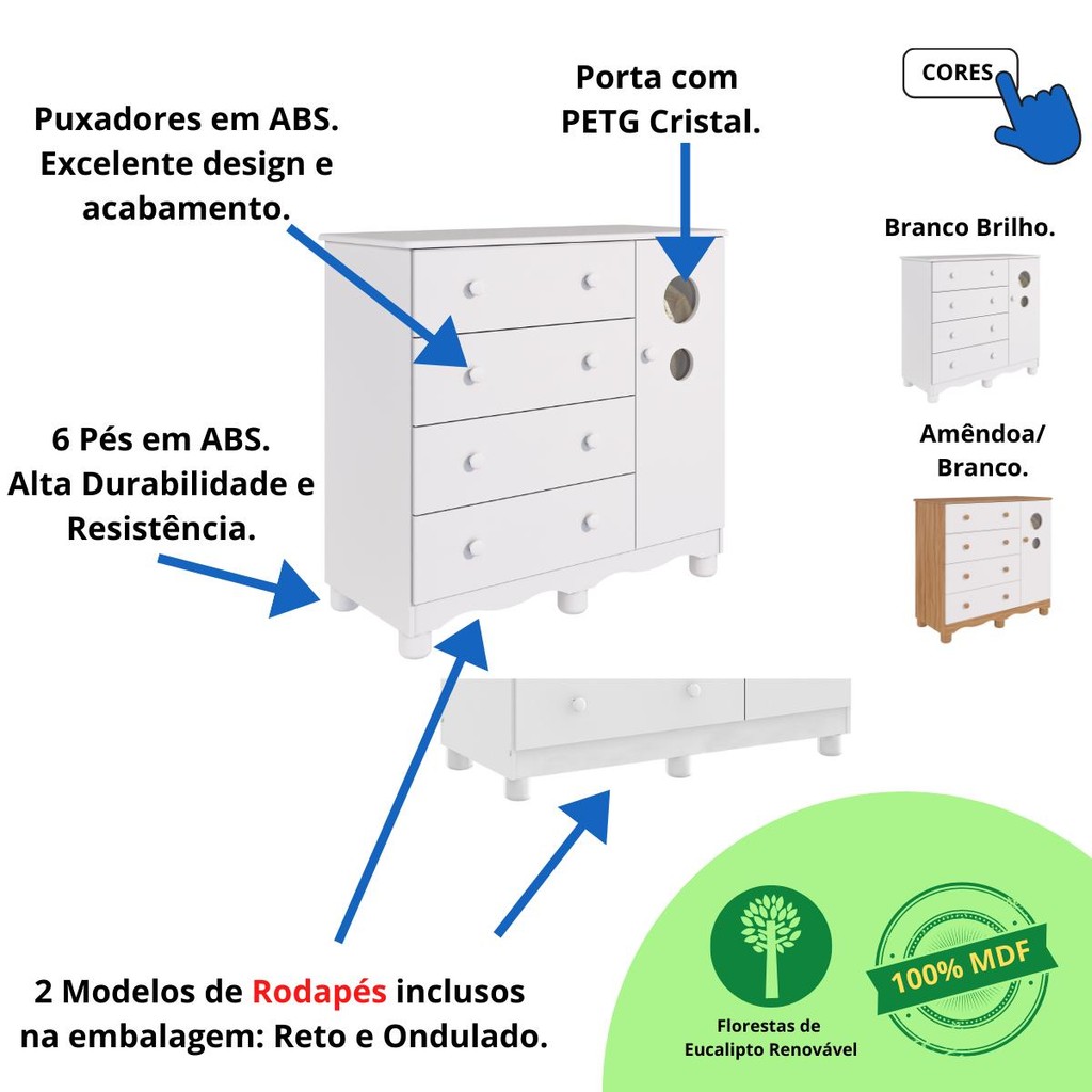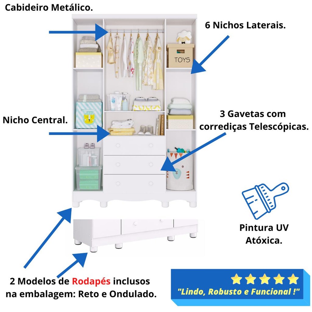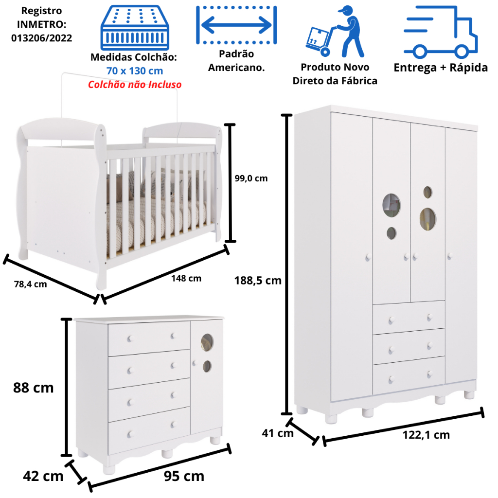 Quarto Bebê Completo Berço Americano Marquesa 3 em 1 Guarda Roupa 4 Portas Cômoda Bolinha 100% MDF