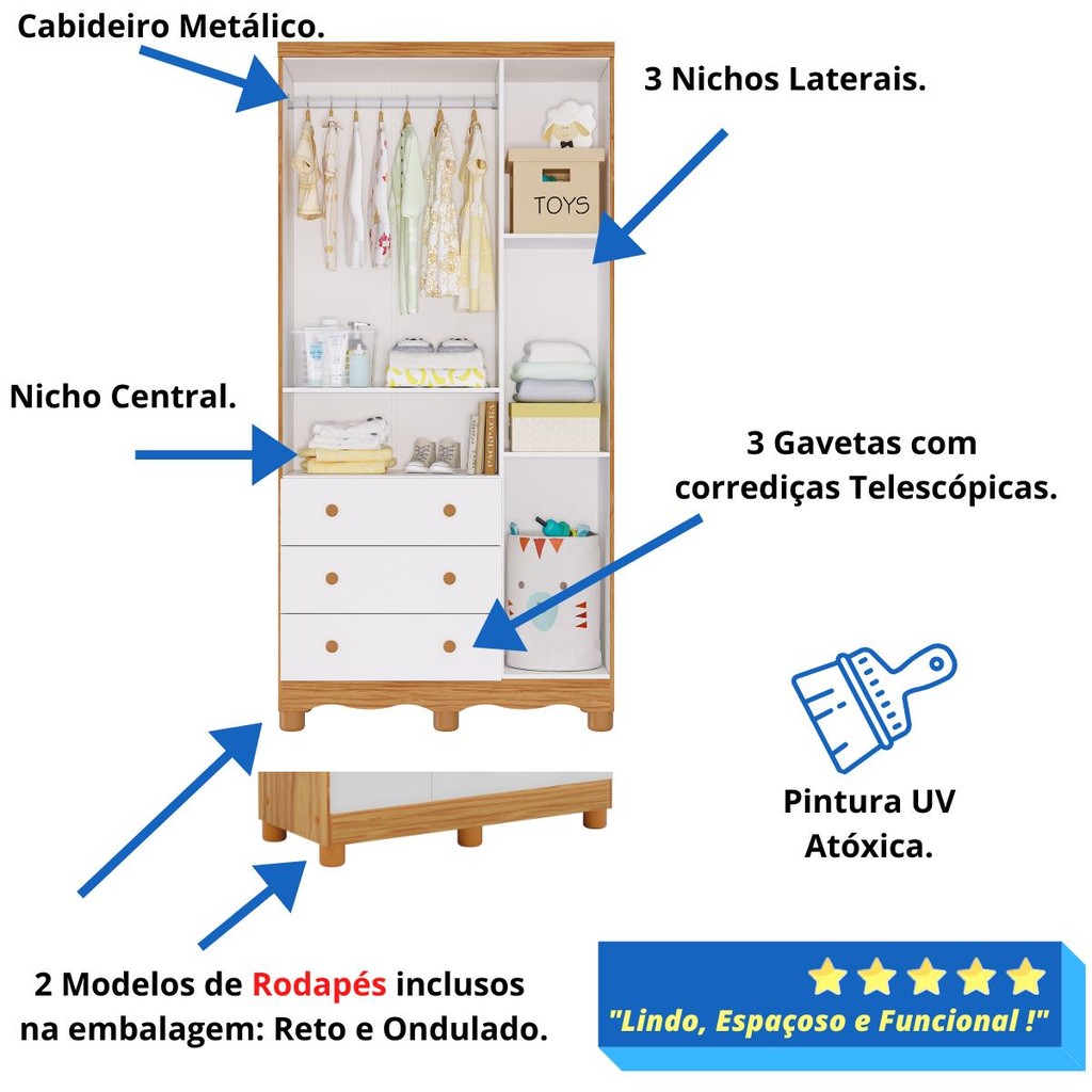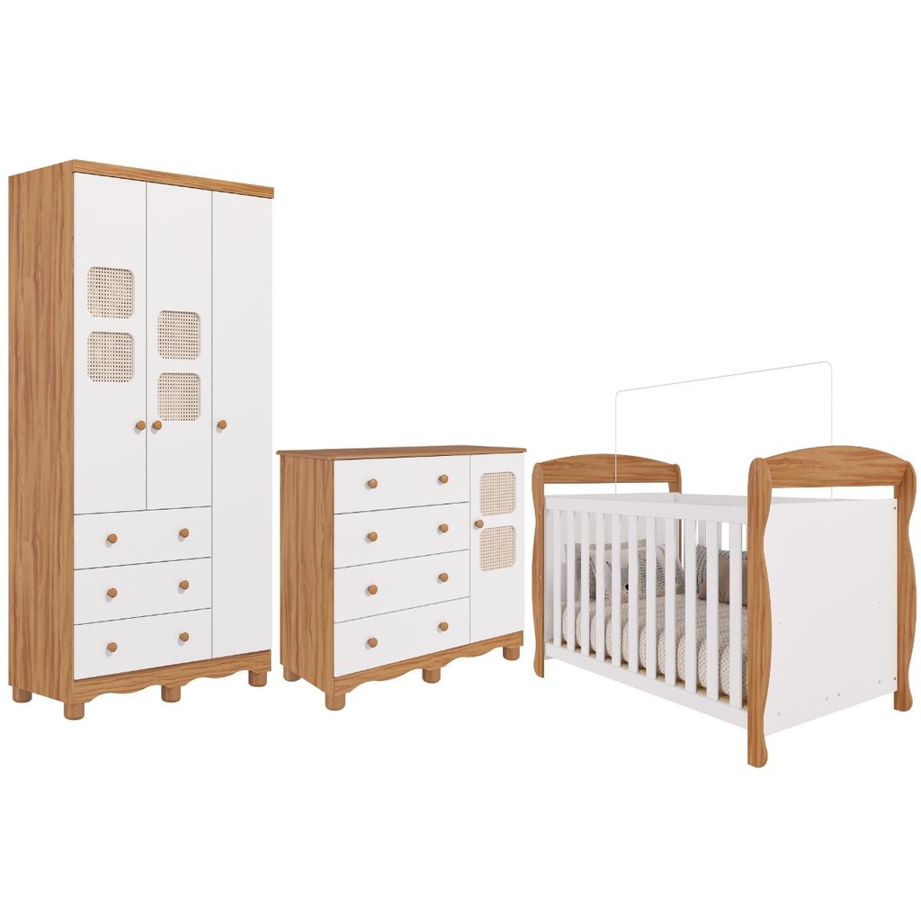 Quarto Bebê Completo Berço Americano Marquesa 3 em 1 Guarda Roupas 3 Portas Cômoda 100% MDF Telinha
