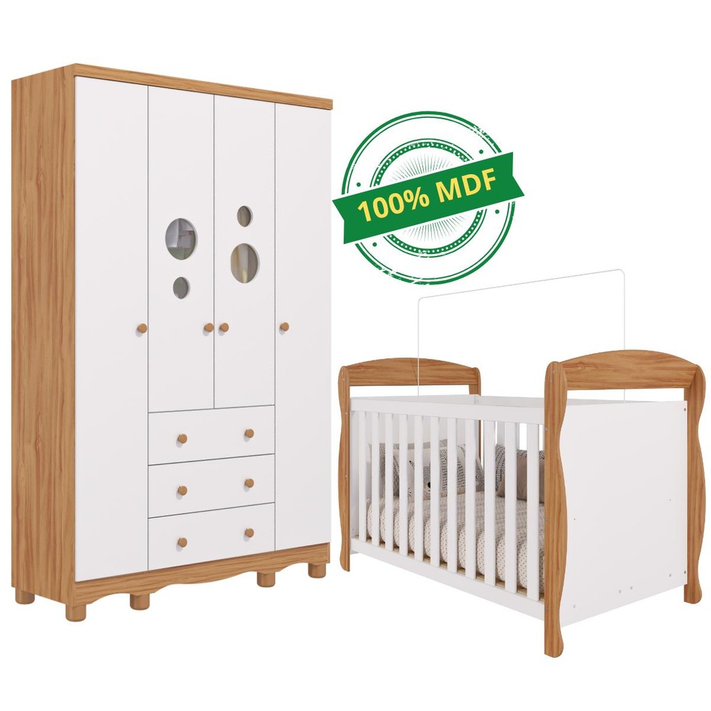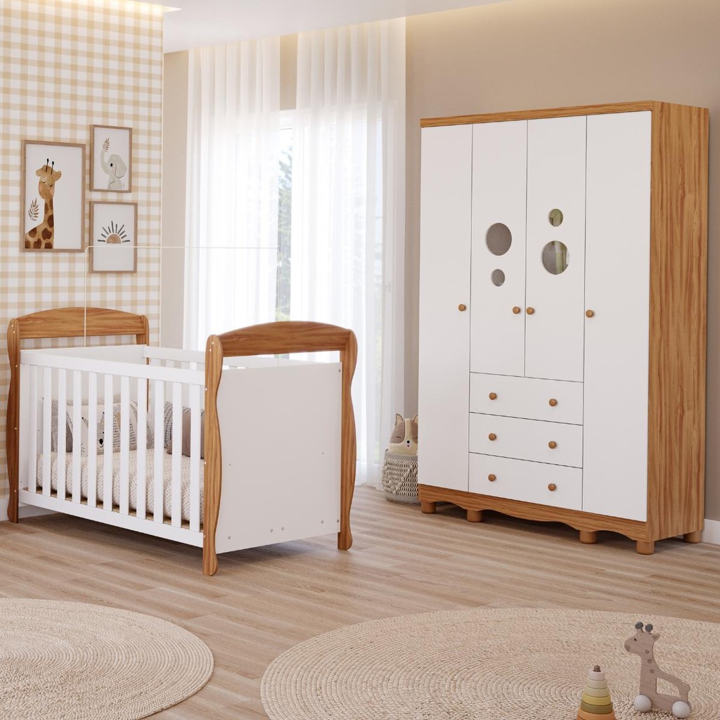 Quarto Bebê Completo Berço Americano Marquesa 3em1 Guarda Roupas 4 Portas 3 Gavetas Bolinha 100% MDF