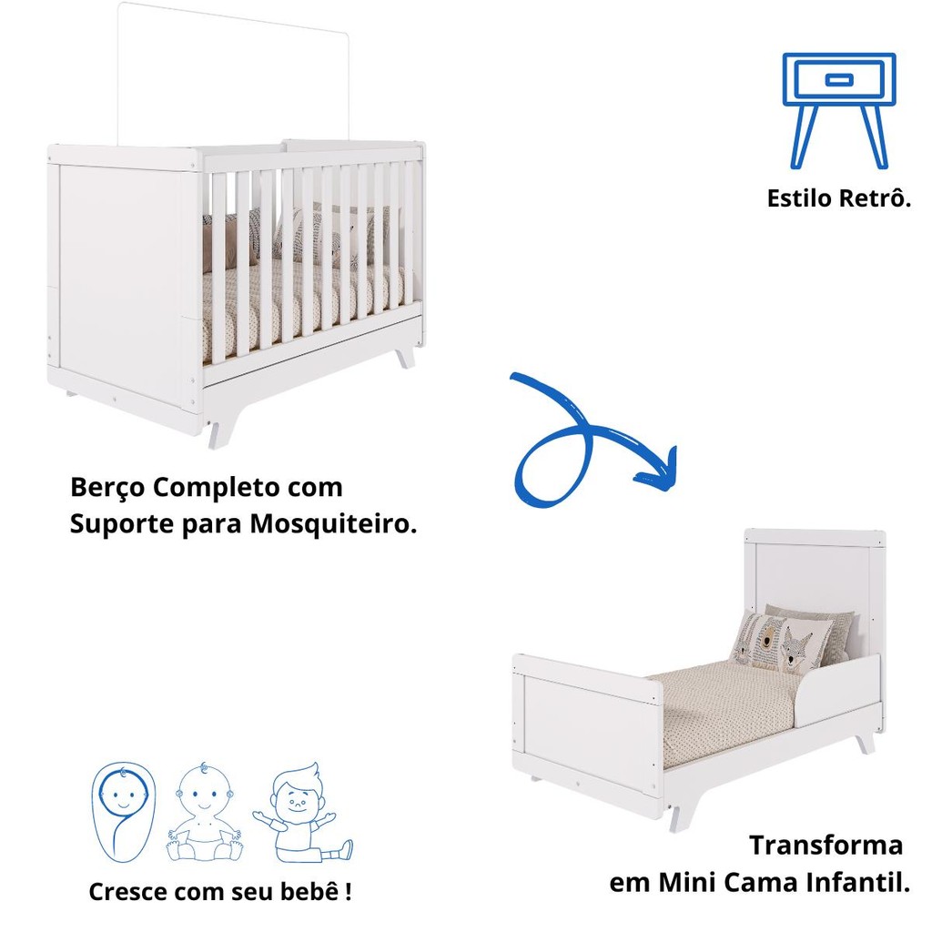 Quarto Bebê Retrô Completo com Guarda Roupa 4 Portas Berço Mini Cama Cômoda 4 Gavetas