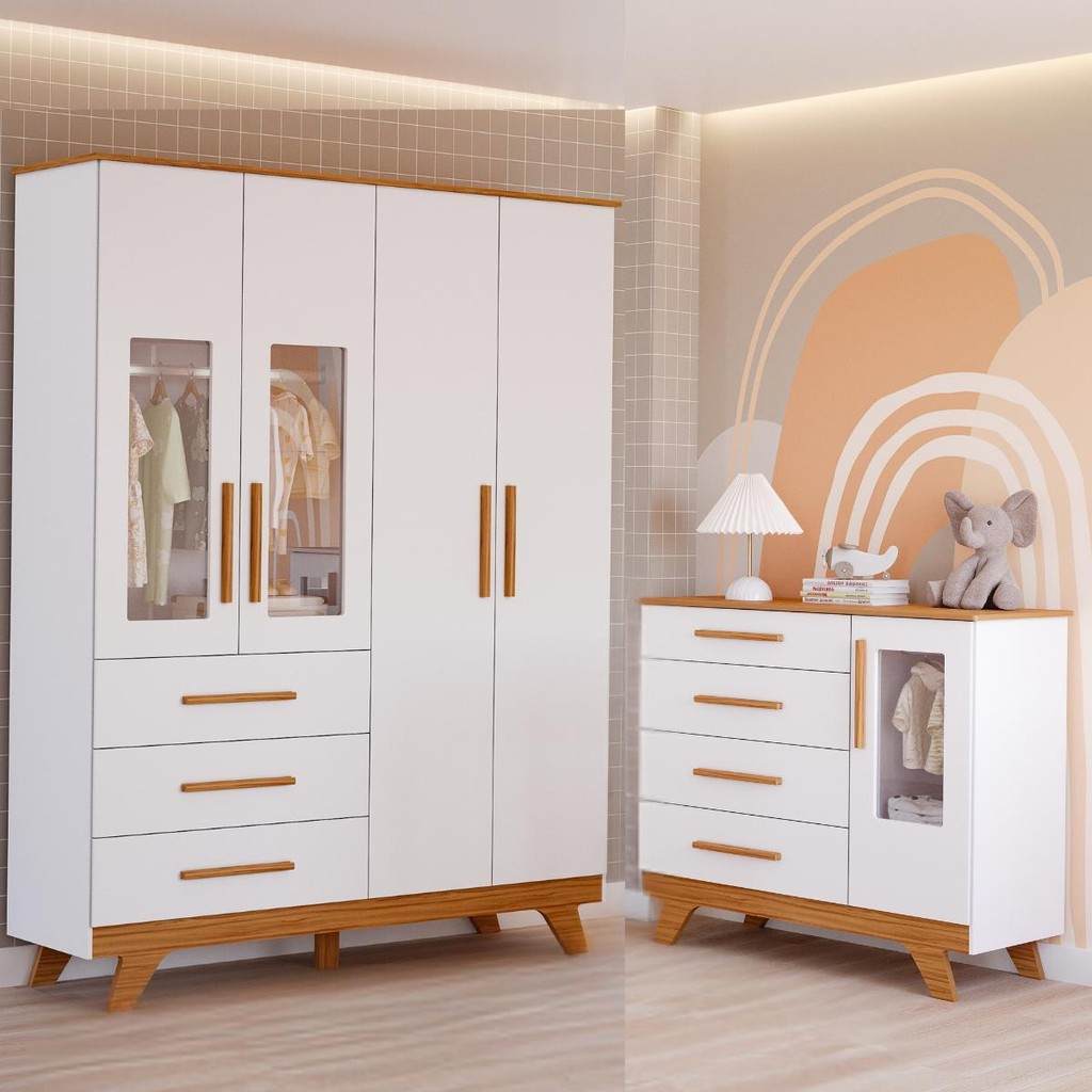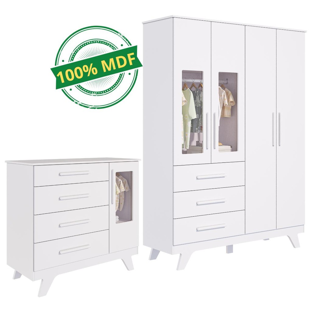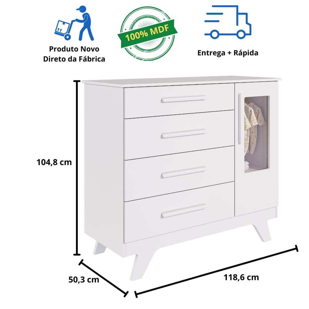 Quarto Bebê Retrô Janelado Completo Guarda Roupa 4 Portas 3 Gavetas Cômoda 4 Gavetas 1 Porta 100%MDF