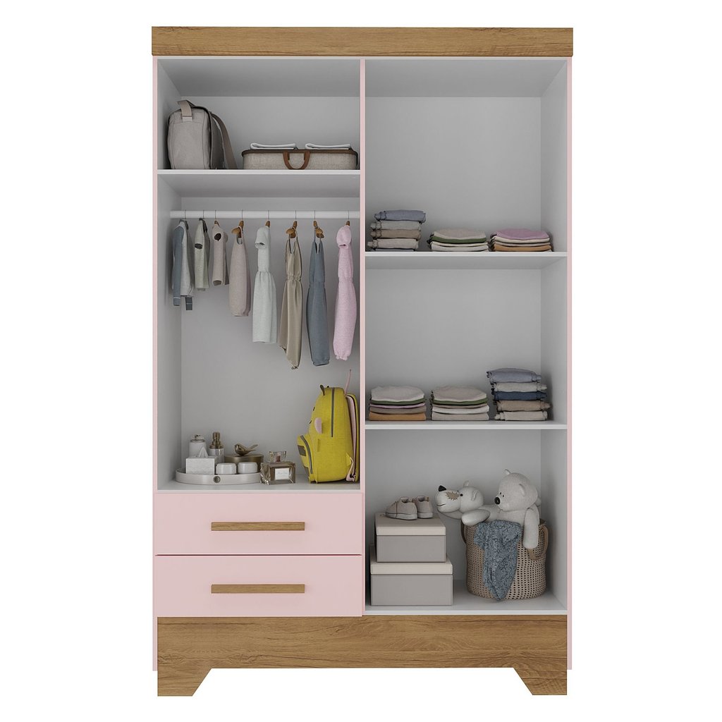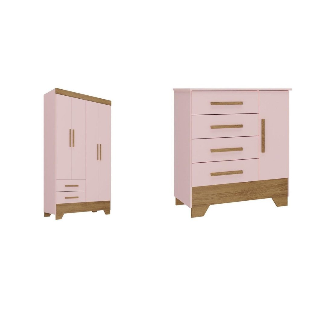 Quarto Infantil Completo Guarda Roupa 4 Portas 2 Gavetas com Cômoda Liz Rosa Fosco/Nature