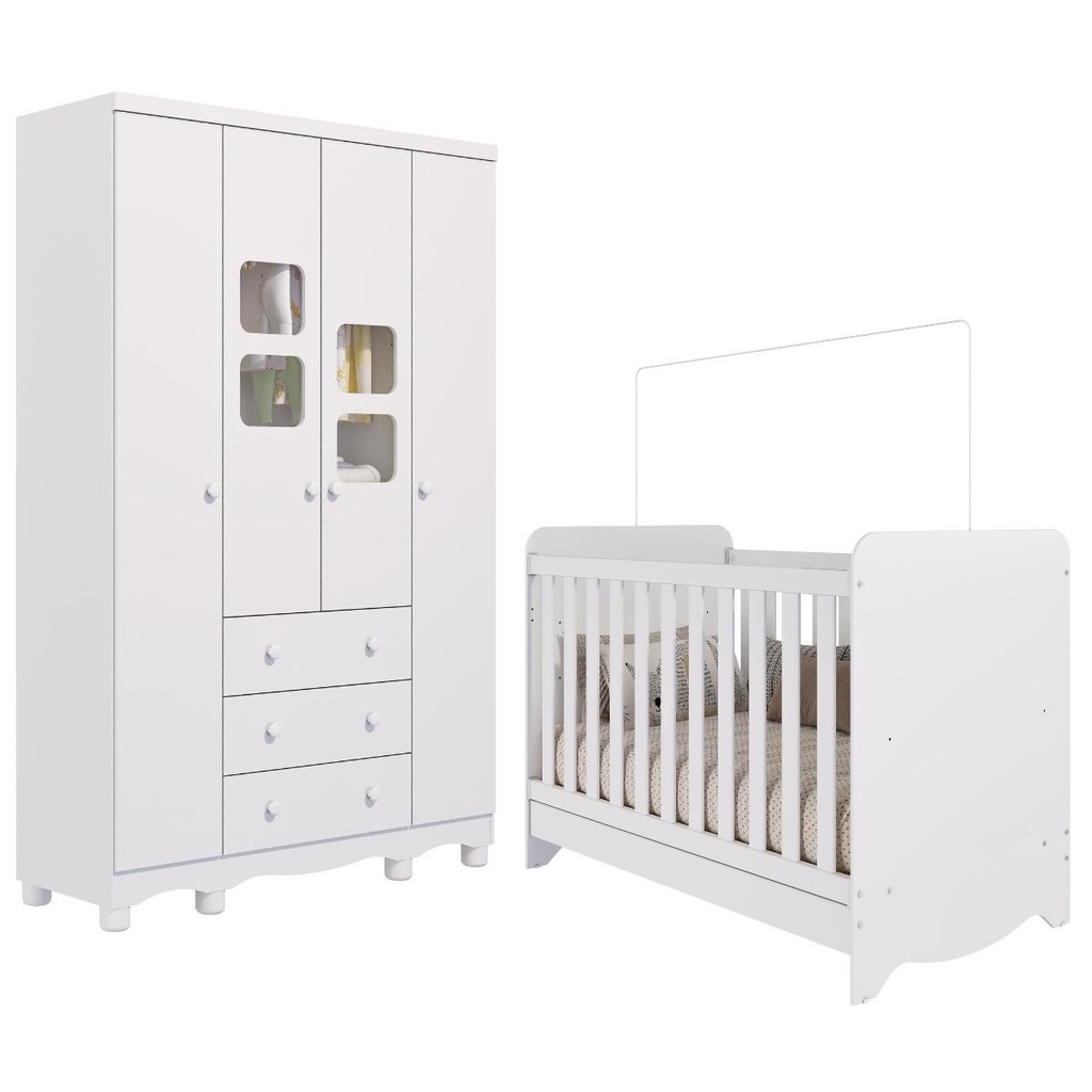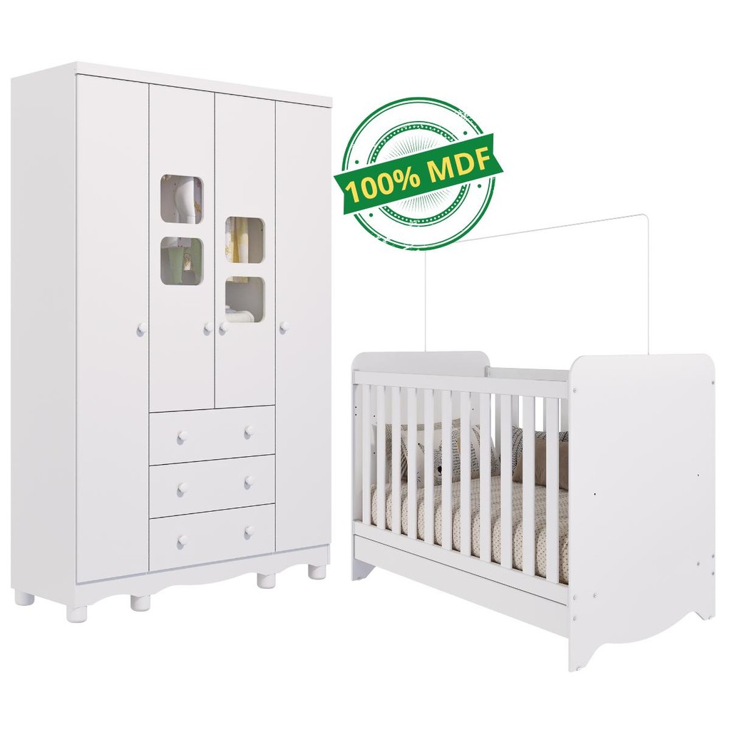 Quarto de Bebê Completo Berço Americano Ben 3 Em 1 Guarda Roupa 4 Portas 3 Gavetas Uli 100% MDF