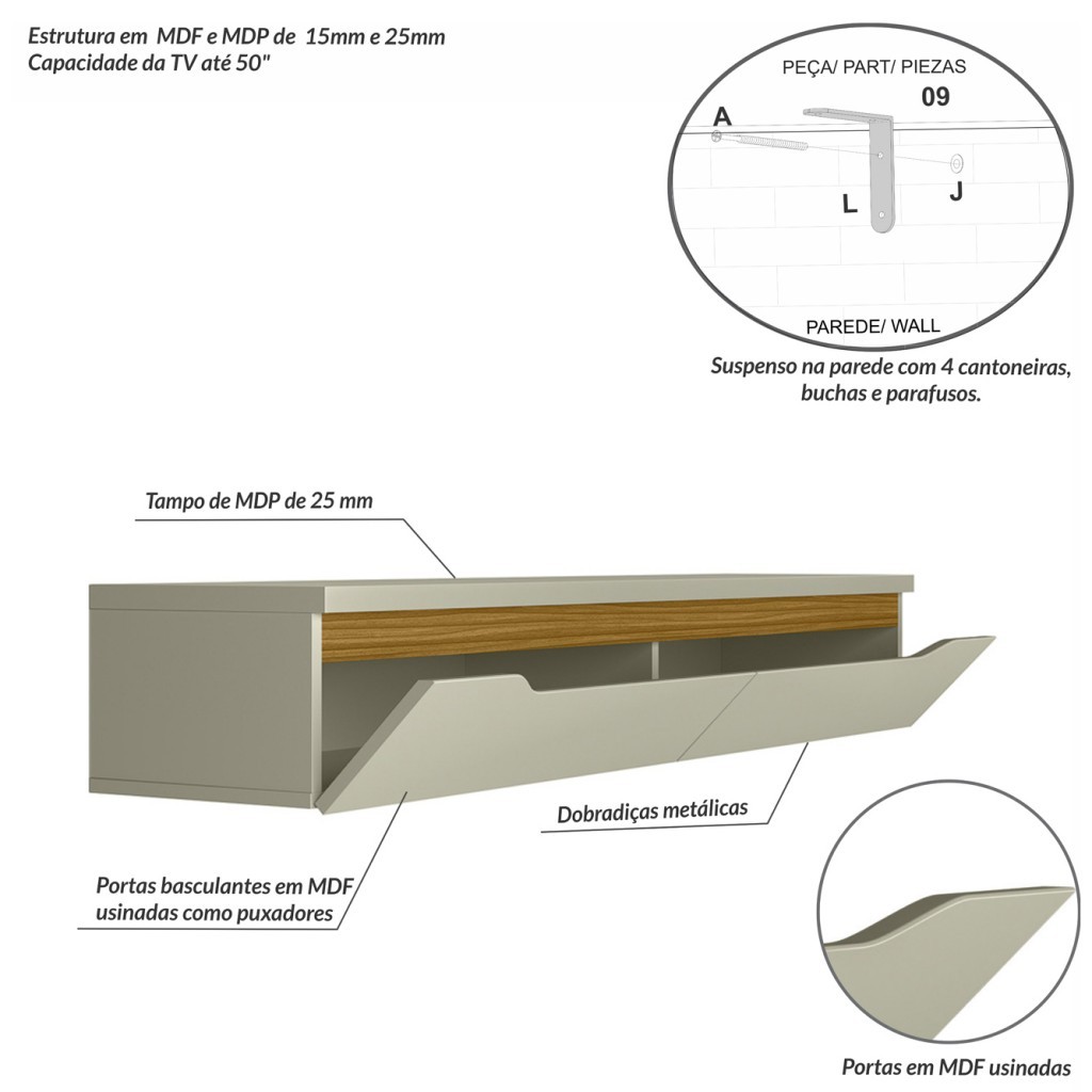Rack Suspenso Uno c/Portas 135cm p/ TV até 50” Design Moderno, Funcional e Compacto p/ Sala e Quarto