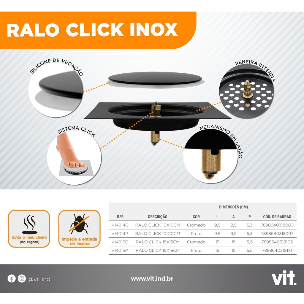 Ralo Click Inteligente 9,5x9,5/10x10/15X15cm Inox Banheiro Veda Cheiro Redondo Quadrado A Escolher