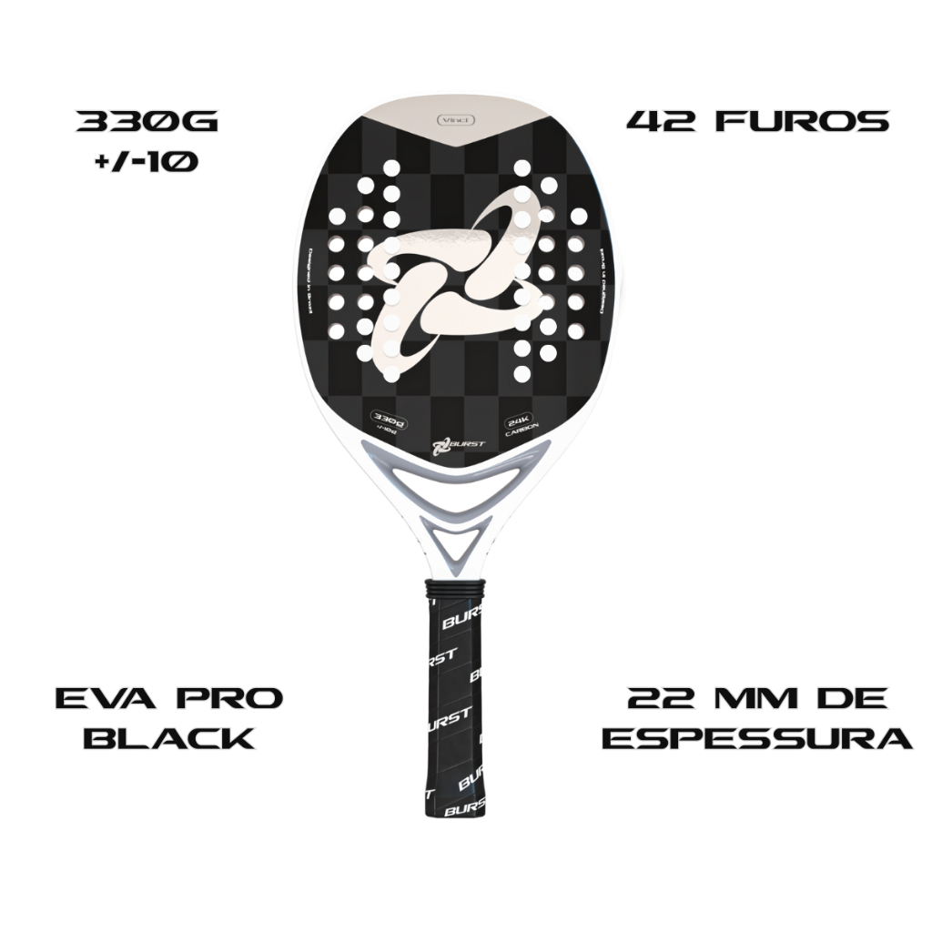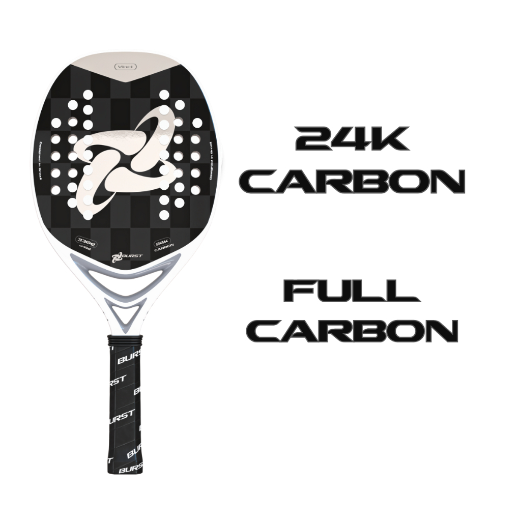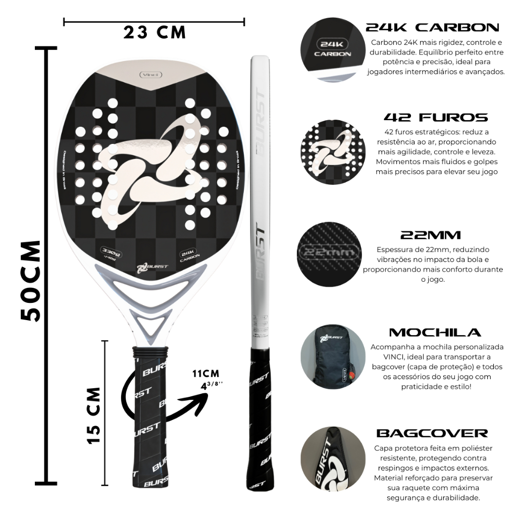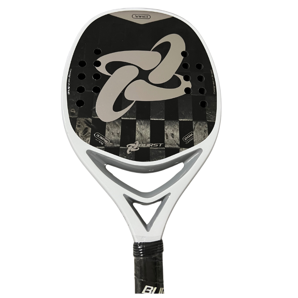 Raquete Burst Beach Tennis Vinci Full Carbono 24K Prata Capa Protetora e Mochila Personalizada