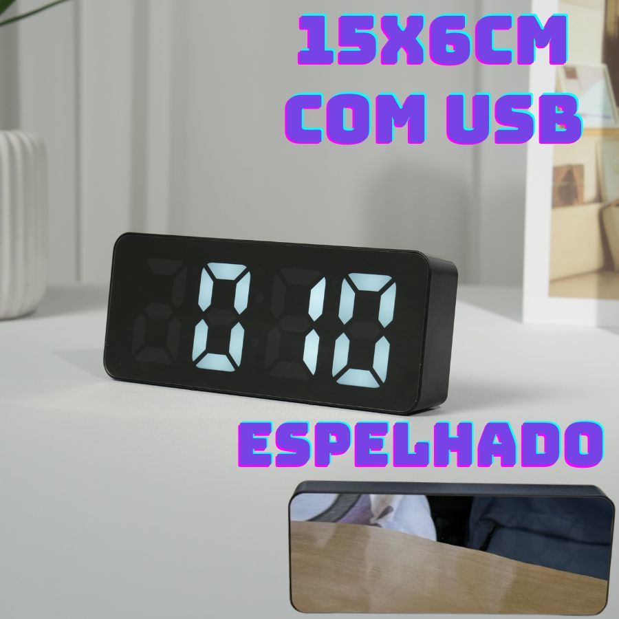 Relógio Digital 16.5x8Cm Com Usb Espelhado Led De Mesa Com Despertador E Temperatura