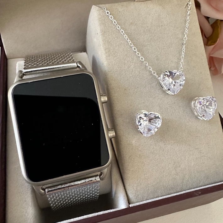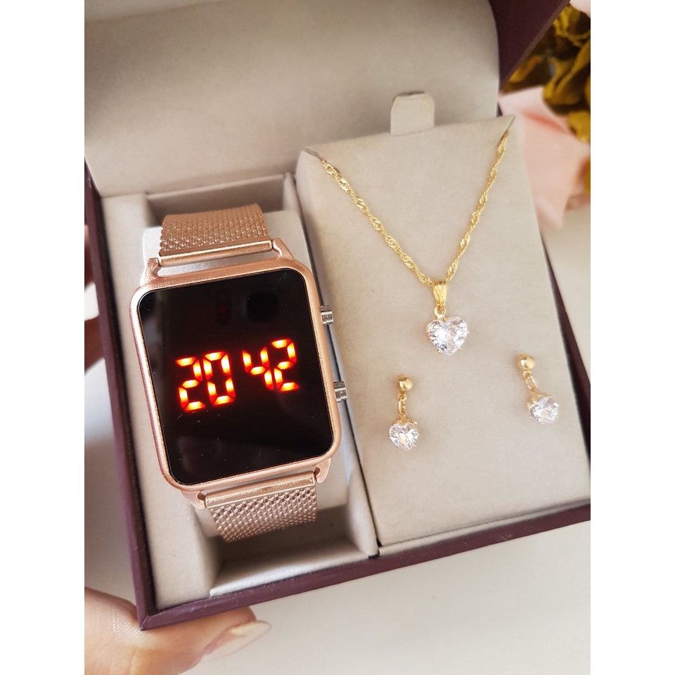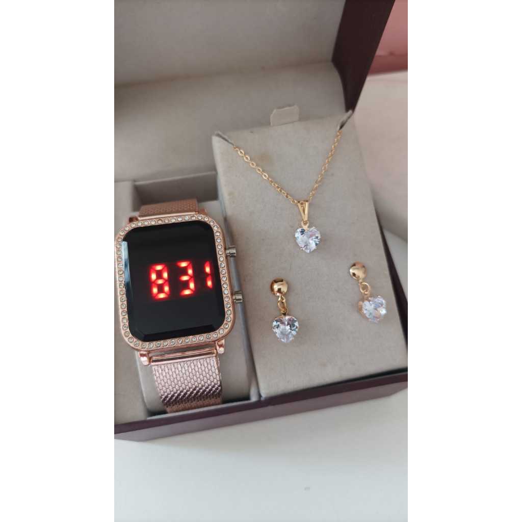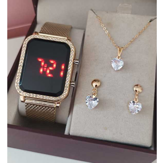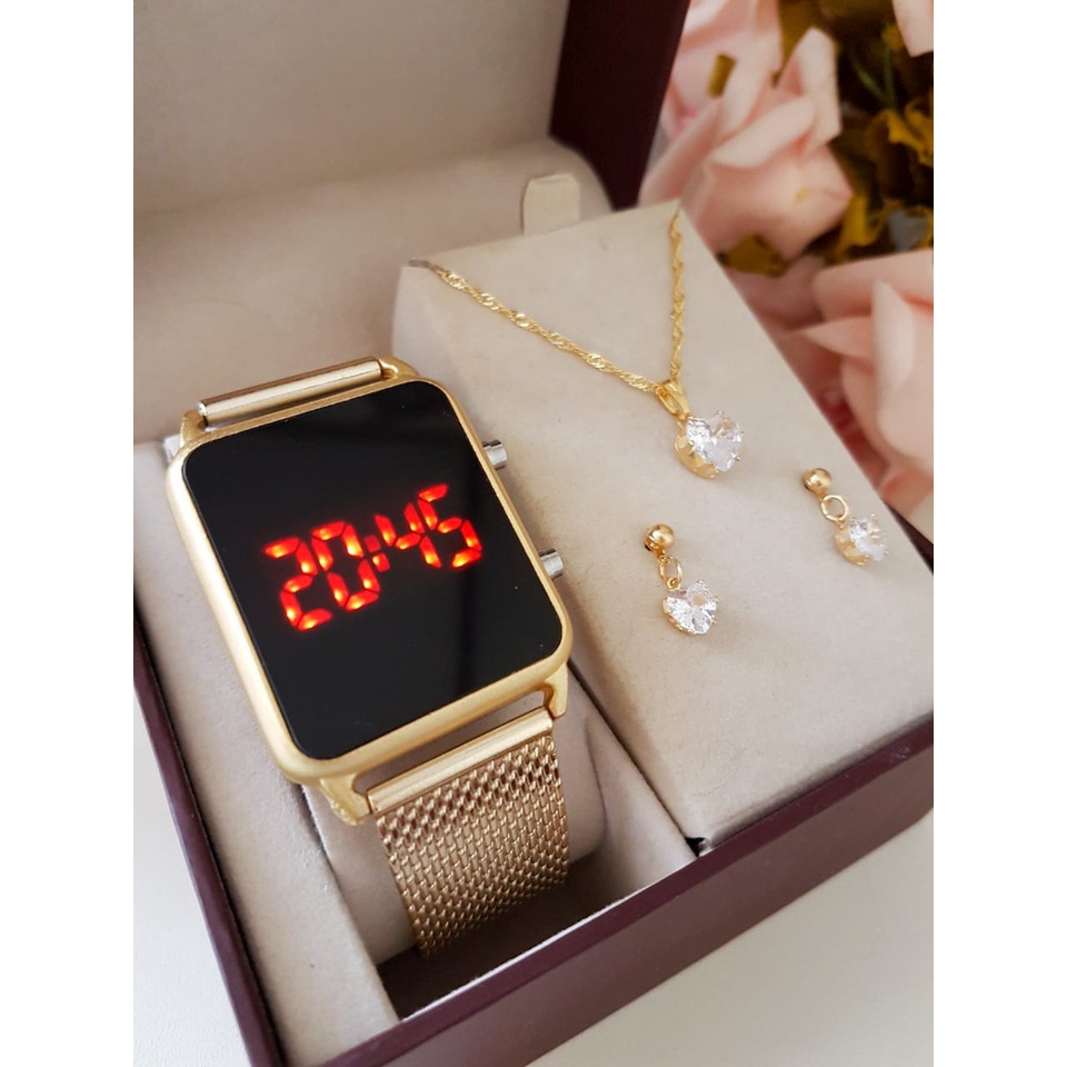 Relógio Feminino Digital Quadrado + Colar e Brinco Folheadas
