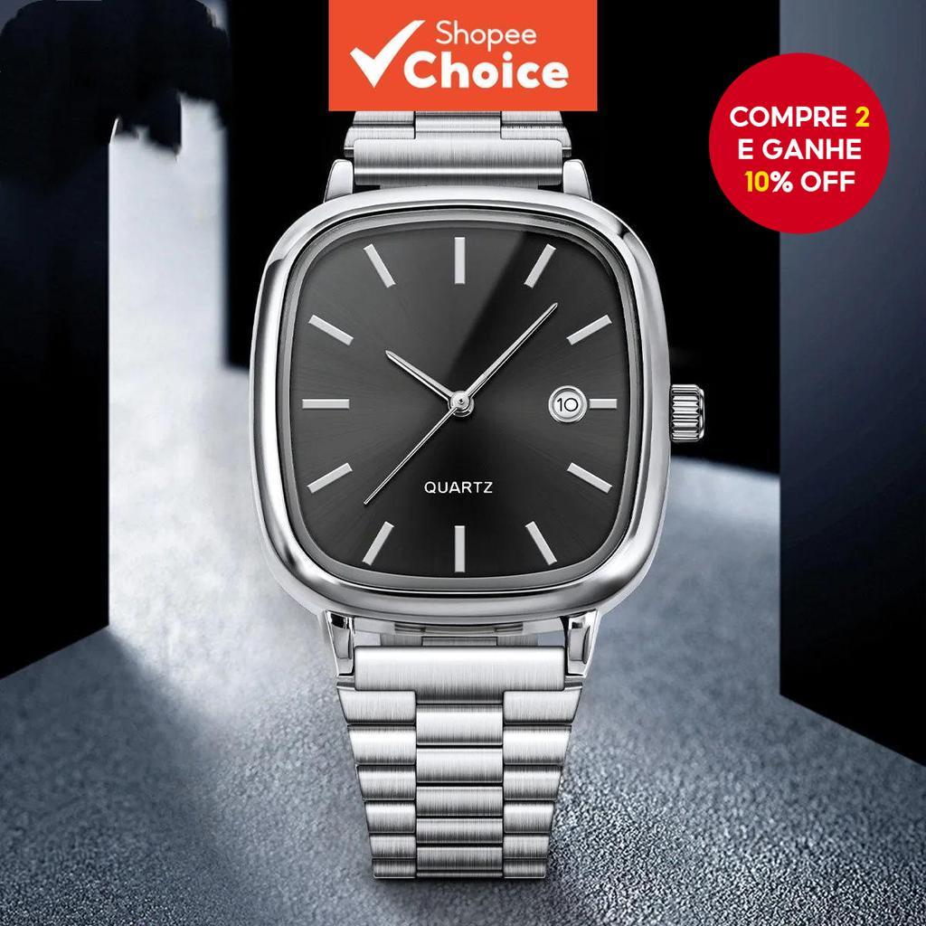 Relógio de Quartzo com Calendário Fashion Square, Luxo, Aço Inoxidável, Relógio de Negócios para Homens