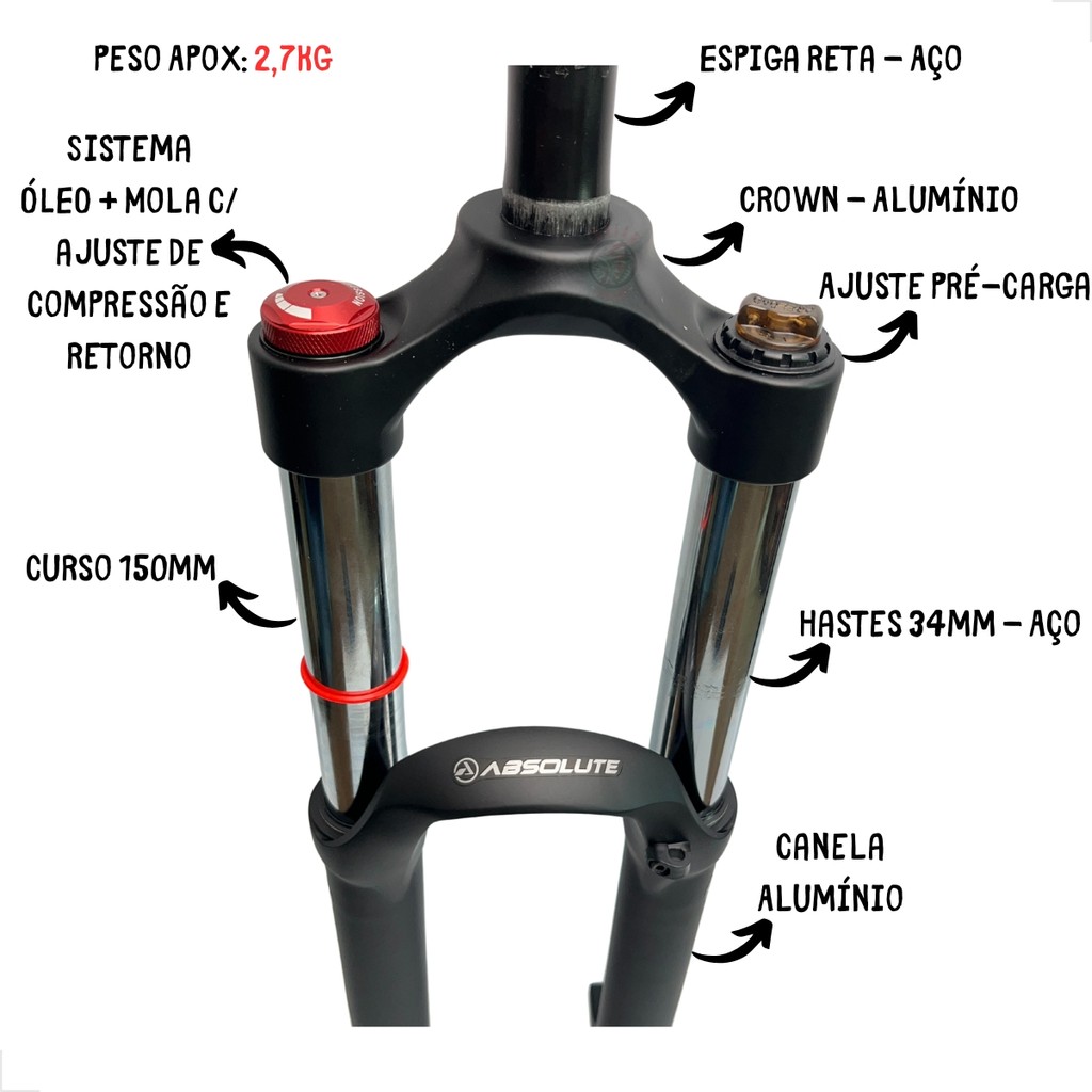 SUSPENSÃO ARO 26 ABSOLUTE BRUTUS FR PRO - 150MM / RETA / ÓLEO+MOLA C/ RETORNO / EIXO 9MM - PRETO