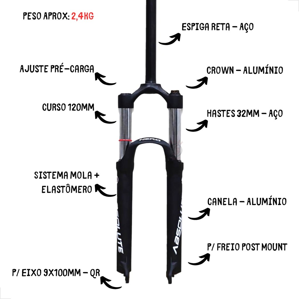 SUSPENSÃO ARO 26 ABSOLUTE NERO 32 - 120MM / RETA / MOLA / EIXO 9MM - PRETO