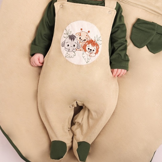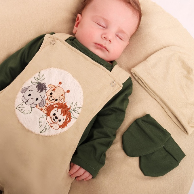 Saída Maternidade Menino Infantil Bebê Safari Verde e Branco 4 Peças com Macacão, Body Touca e Luvas